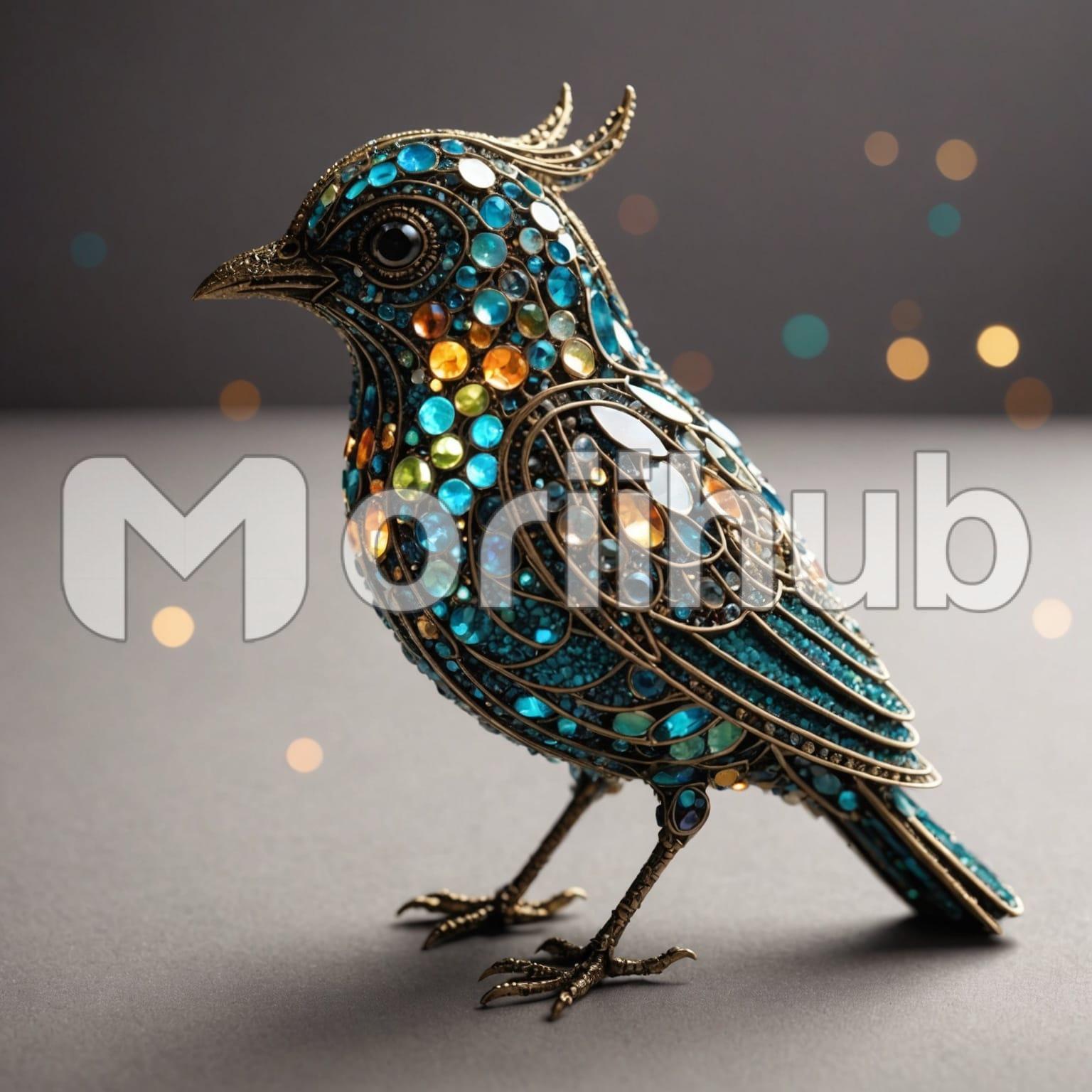 An ornate bird stands gracefully, adorned with shimmering colorful crystals that catch the light from every angle. Each feather is intricately decorated, creating a dazzling mosaic that glistens with an array of hues. The crystals form elegant patterns along the wings and tail, accentuating the bird’s natural beauty. Its bright eyes reflect a hint of sparkle, adding a touch of magic to its gaze. The delicate arrangement of the crystals gives the bird an otherworldly charm, transforming it into a breathtaking spectacle that captures the imagination and invites admiration from all who see it.