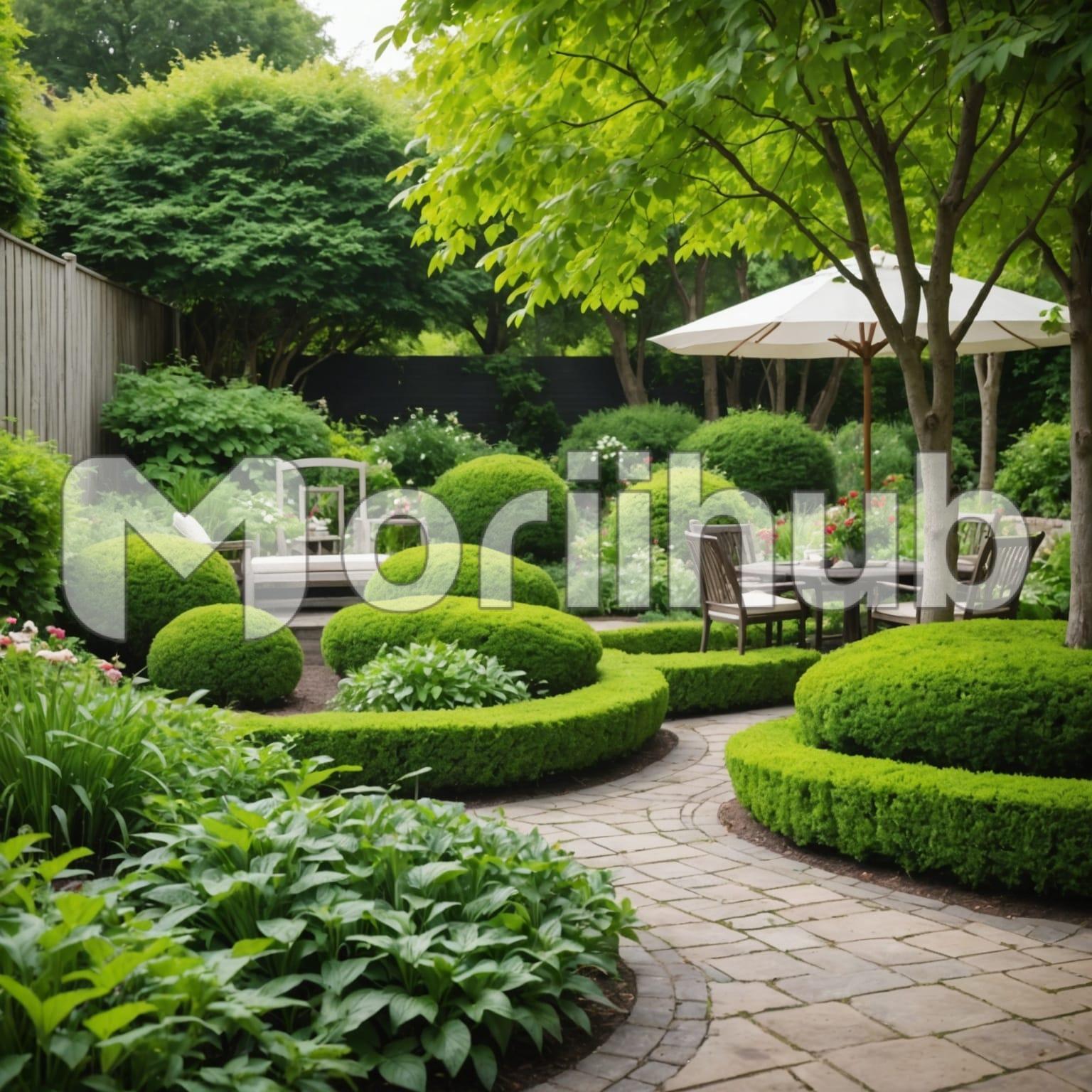 In the yard, a set of chairs is arranged around a round table, offering a perfect spot for outdoor relaxation. An umbrella overhead provides shade, casting a cool, inviting shadow over the setup. The table, simple yet functional, is the centerpiece of this cozy outdoor scene. Trimmed bushes surround the area, their neat appearance adding a touch of order and greenery. In the corners of the yard, tall trees stand watch, their presence enhancing the natural ambiance. The overall scene feels serene and well-kept, ideal for quiet moments outdoors.