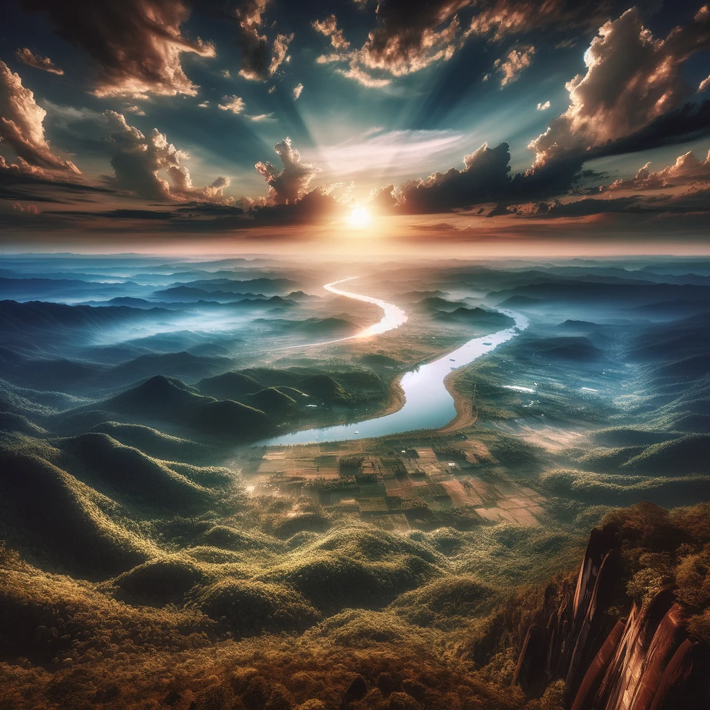 In a serene and expansive landscape, the concept of ‘outlook’ unfolds from a high vantage point, offering a breathtaking view of a vast valley below. Rolling hills cascade into the distance, cloaked in verdant greenery, while a meandering river winds its way through the fertile plains. The horizon stretches endlessly, merging with the soft hues of the sky, inviting contemplation and awe at the grandeur of nature’s embrace.