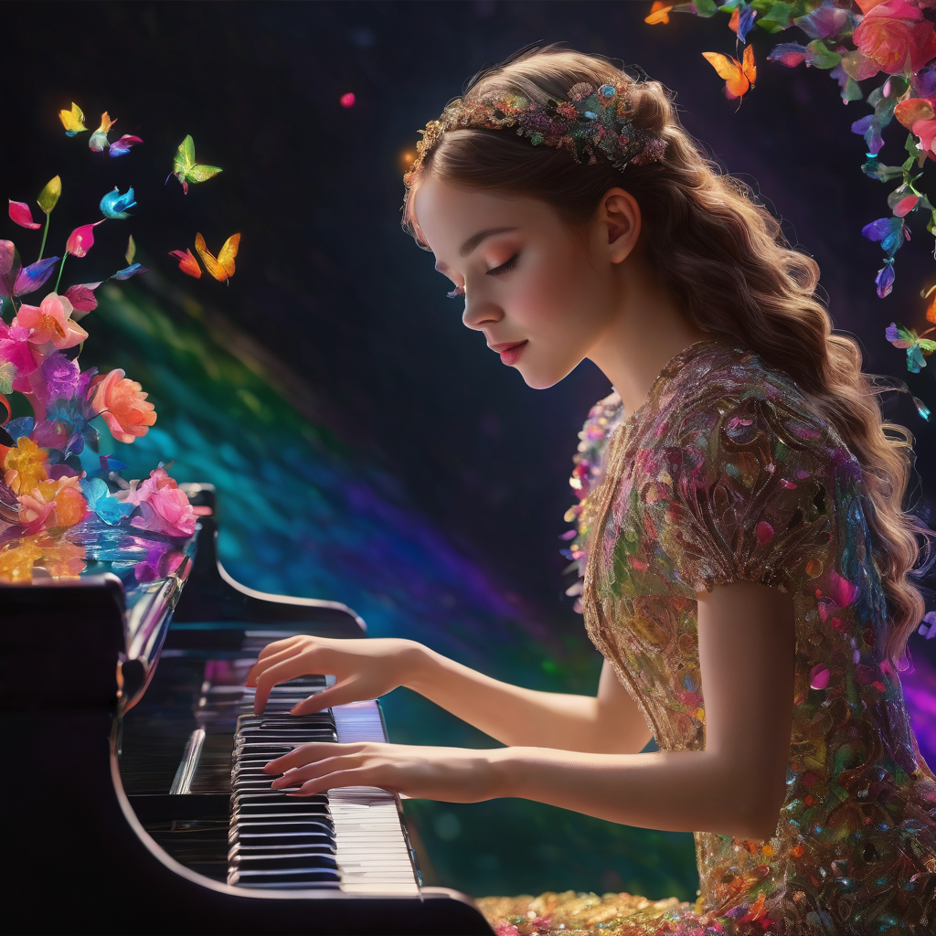 Immersed in melody, a girl plays the keyboard with finesse against a vibrant backdrop. Each keystroke weaves a symphony, her fingers dancing on the keys with precision. The colorful background mirrors the dynamic notes, creating a visual harmony. Her passion resonates, transforming the moment into a kaleidoscopic fusion of music and vivid hues.