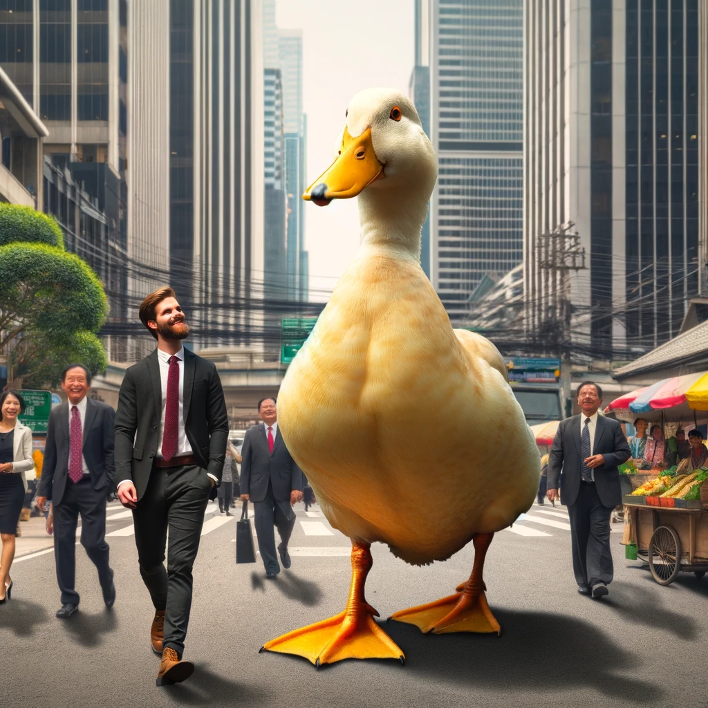 In the midst of the urban hustle, a large duck with bright yellow feathers struts confidently through the busy city street. Its webbed feet patter against the pavement, drawing curious glances from passersby. Undeterred by the chaos around it, the duck maintains its dignified pace, a charming anomaly in the concrete jungle.