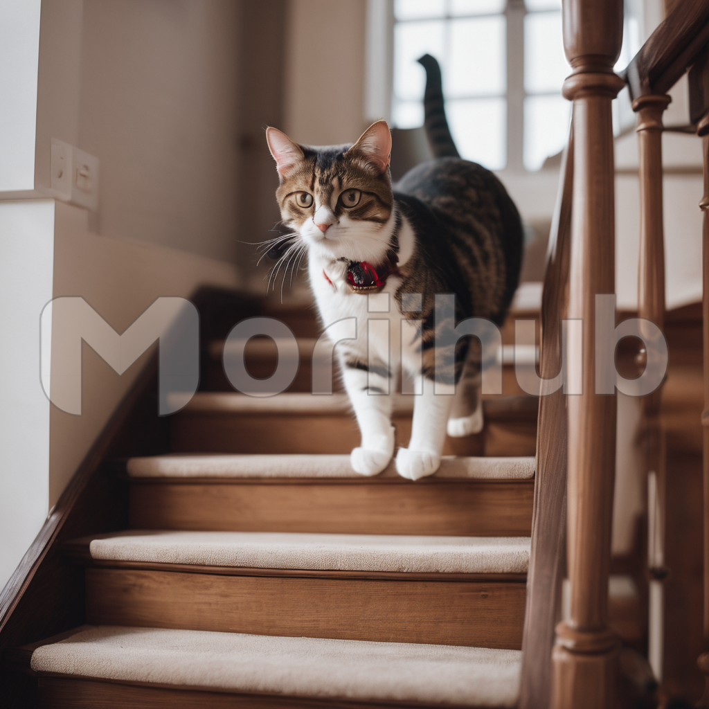 Grace personified, a sleek cat descends the stairs with a deliberate and silent elegance. Each step is a measured descent, paws touching down with feline precision. The soft pad of its paws barely makes a sound, adding to the stealthy allure. Its tail gracefully sways like a pendulum, balancing the feline form. The play of light and shadow accentuates its sleek silhouette, creating a cinematic tableau as the cat effortlessly navigates the staircase, a masterclass in feline poise.