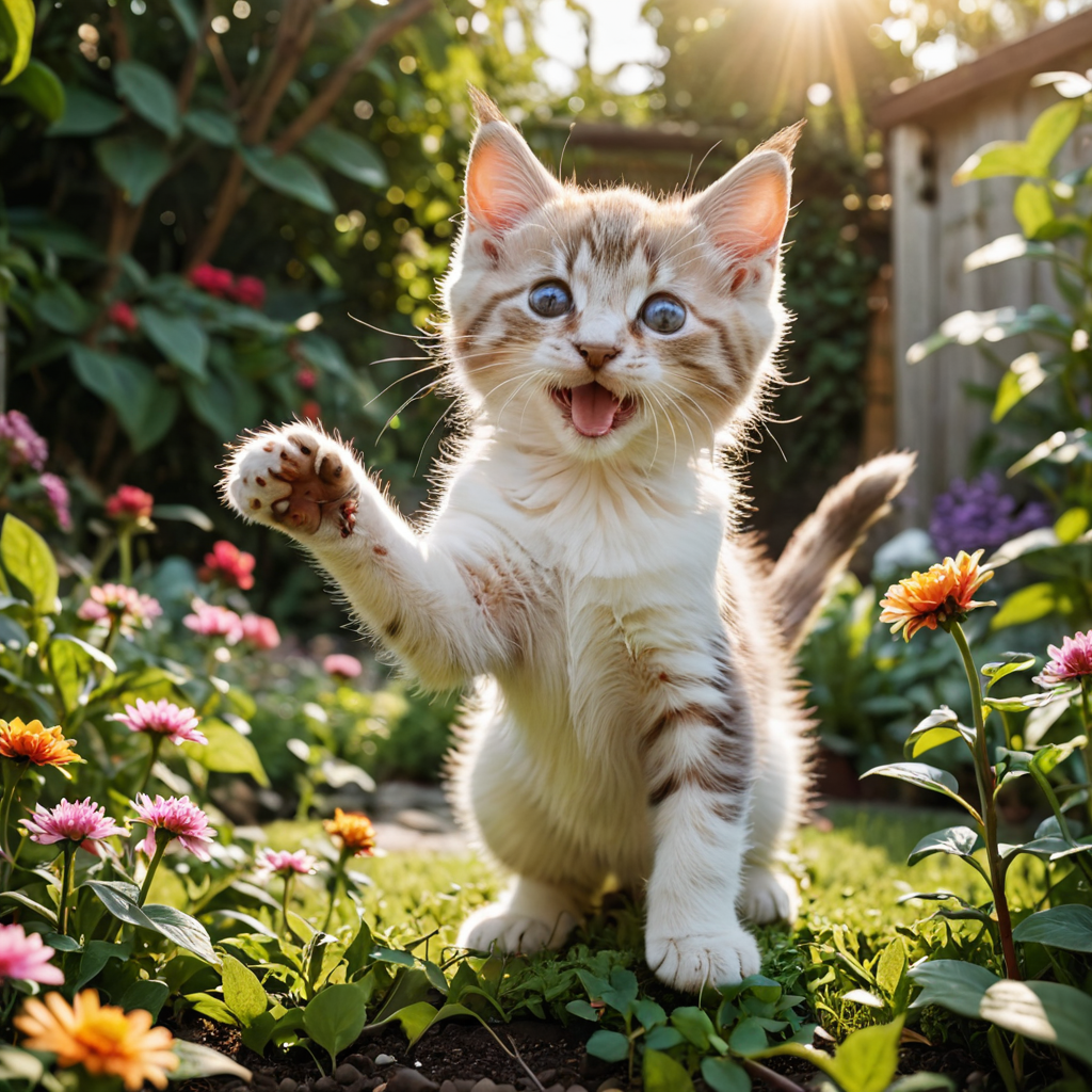 In the tranquil garden, a cute kitten frolics amidst a tapestry of vibrant blooms and swaying grass. With each delicate step, its tiny paws dance upon the soft earth, exploring every nook and cranny with boundless curiosity. Bright eyes twinkle with wonder as it playfully pounces on fallen leaves, one front paw raised in anticipation, adding a touch of whimsy to the serene setting. Amidst nature’s beauty, the kitten’s playful antics bring joy and innocence to the garden’s embrace.