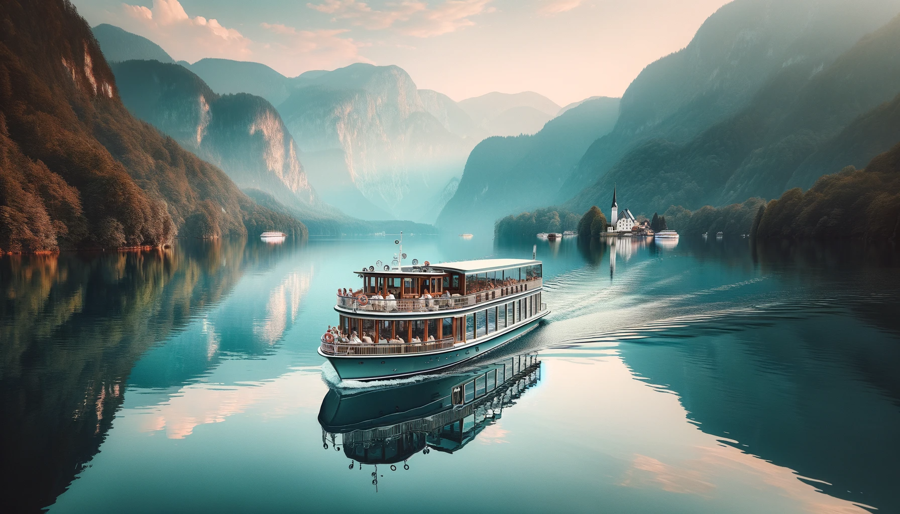In this tranquil boat cruise moment, the essence of relaxation washes over as a sleek, modern cruise boat glides effortlessly on serene waters. The gentle rocking of the vessel creates a soothing rhythm, allowing passengers to unwind and savor the picturesque views. The soft caress of the breeze, coupled with the sound of lapping waves, lulls everyone into a state of perfect tranquility, making it a serene and rejuvenating journey on water.