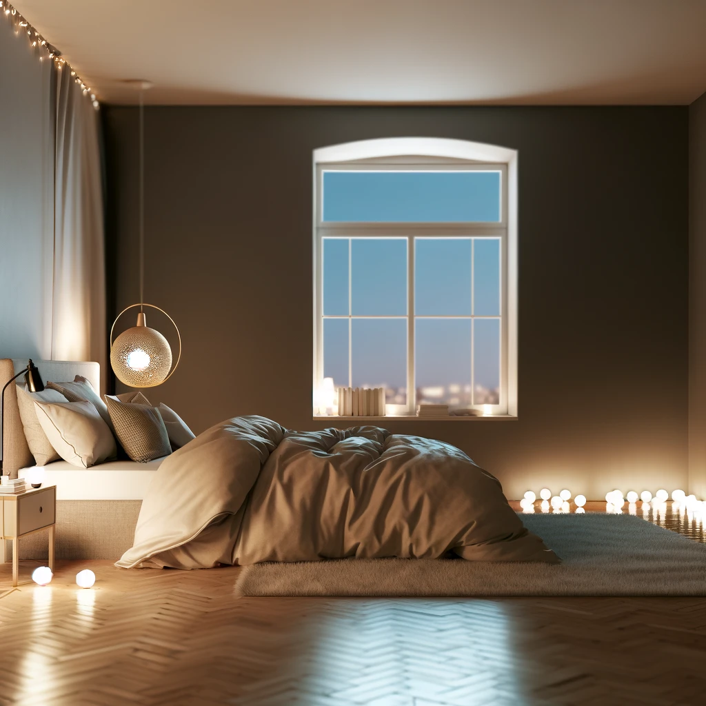 In this inviting bedroom, soft light spills from elegant fixtures, creating a warm and welcoming atmosphere. The spacious layout is adorned with tasteful décor, offering a perfect balance of comfort and style. A generously sized bed, adorned with plush pillows and a luxurious duvet, beckons with promises of restful nights and peaceful dreams.