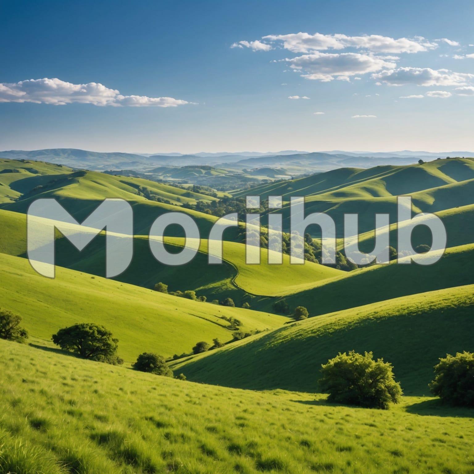 Undulating green hills roll gently across the landscape, their vibrant hues varying from deep emerald to soft olive. The hills create a soothing rhythm, inviting the eye to wander over their curves and dips. Above, wisps of fluffy clouds drift lazily in the sky, their delicate forms contrasting beautifully with the rich greenery below. The clouds cast soft shadows that dance across the hillsides, enhancing their contours. This picturesque scene evokes a sense of peace and tranquility, a perfect blend of nature’s beauty and serenity.