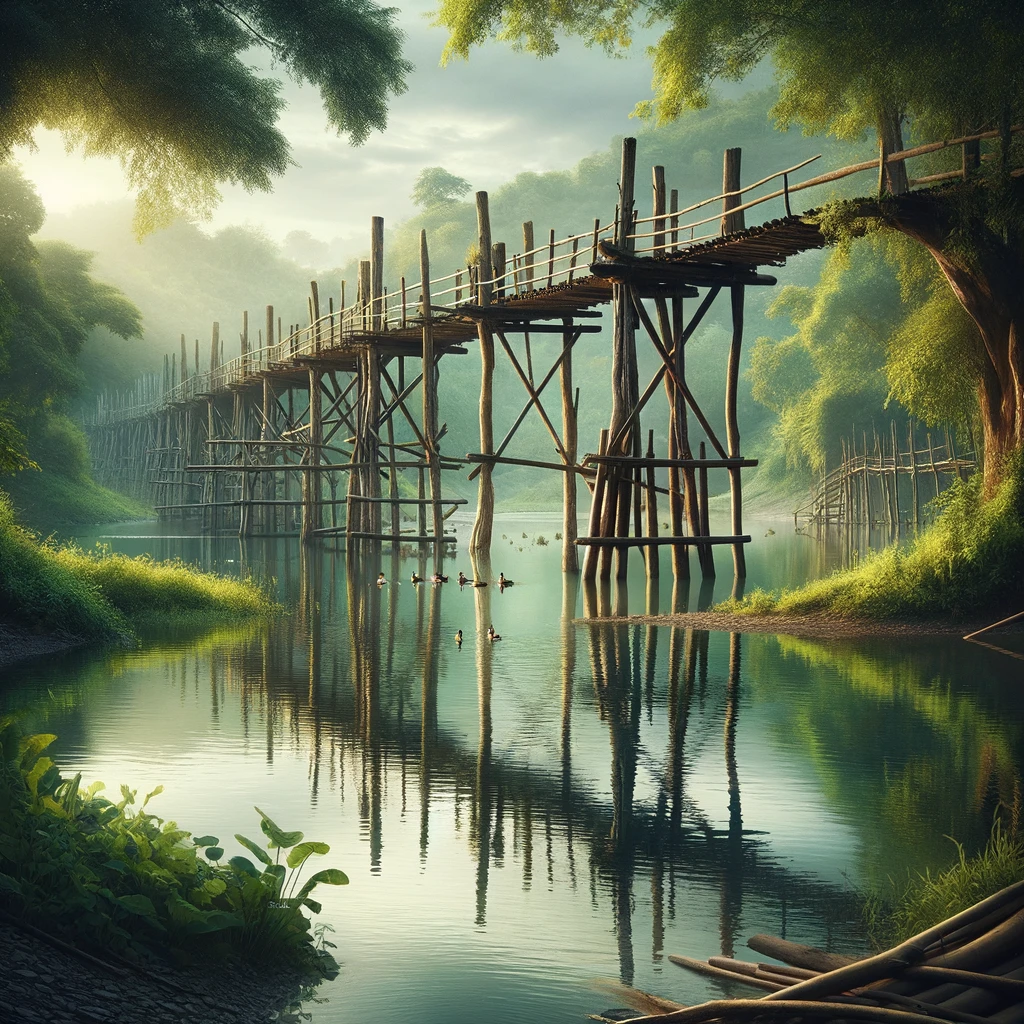 In a serene landscape, a traditional wooden bridge spans gracefully over a tranquil river. Its rustic charm emanates from weathered planks and sturdy poles, standing in harmony with nature’s tranquility. The gentle flow of the river reflects the bridge’s timeless beauty, inviting peaceful contemplation amidst the serene surroundings.