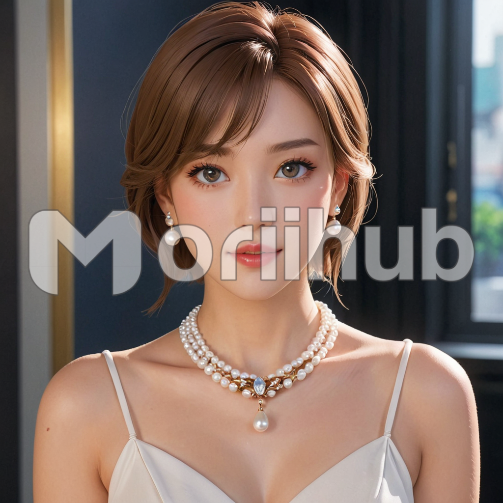 Amidst an aura of timeless elegance, a beautiful woman graces the scene, adorned with a lustrous pearl necklace. Her gaze, serene and captivating, fixates on a distant horizon, lost in contemplation. Each delicate pearl gleams softly, accentuating her grace and sophistication. With a demeanor of poise and refinement, she commands attention, her presence magnetic and alluring. In this moment of quiet introspection, she embodies the essence of beauty and grace, a vision of sophistication amidst the ever-changing currents of the world.