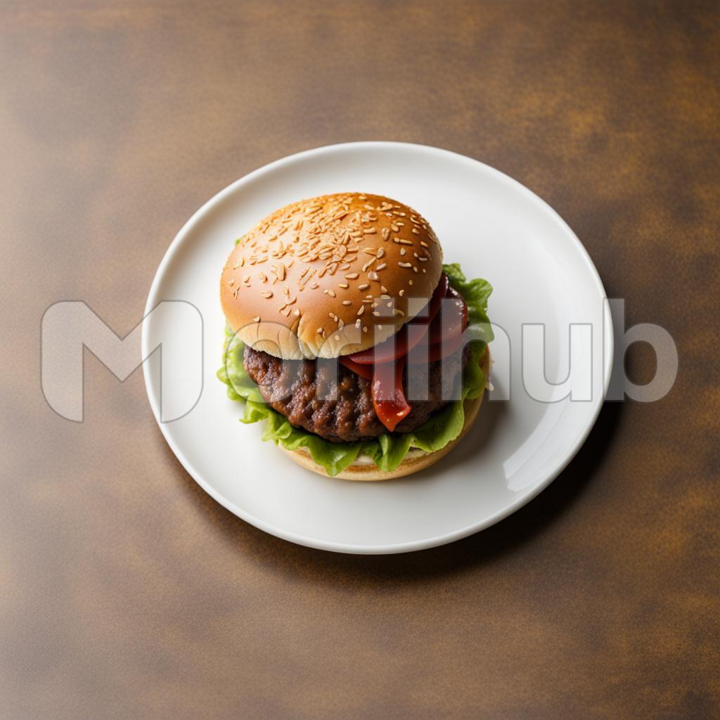 Perched on a pristine white plate, a hamburger unveils its culinary allure. The golden-brown bun cradles a succulent patty, its juicy perfection peeking through the layers of fresh, crisp lettuce and ripe tomatoes. A symphony of colors and textures, the hamburger beckons with a promise of savory indulgence. Glistening condiments and melted cheese complete the masterpiece. The plate becomes a canvas, and the hamburger, a gastronomic masterpiece ready to tantalize taste buds with the harmony of flavors and the visual appeal of a culinary delight.