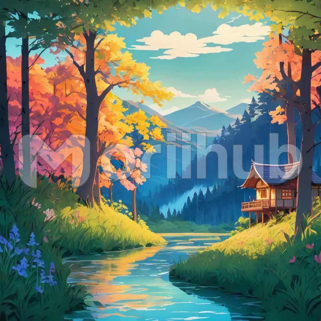 In the whimsical cartoon scene, a meandering stream winds through a lush woodland, its waters shimmering with playful animation. On the opposite bank, a quaint wooden cabin nestled amidst the trees adds to the scene’s charm. With its colorful portrayal and lively animation, the scene invites viewers to immerse themselves in the enchanting world of imagination.