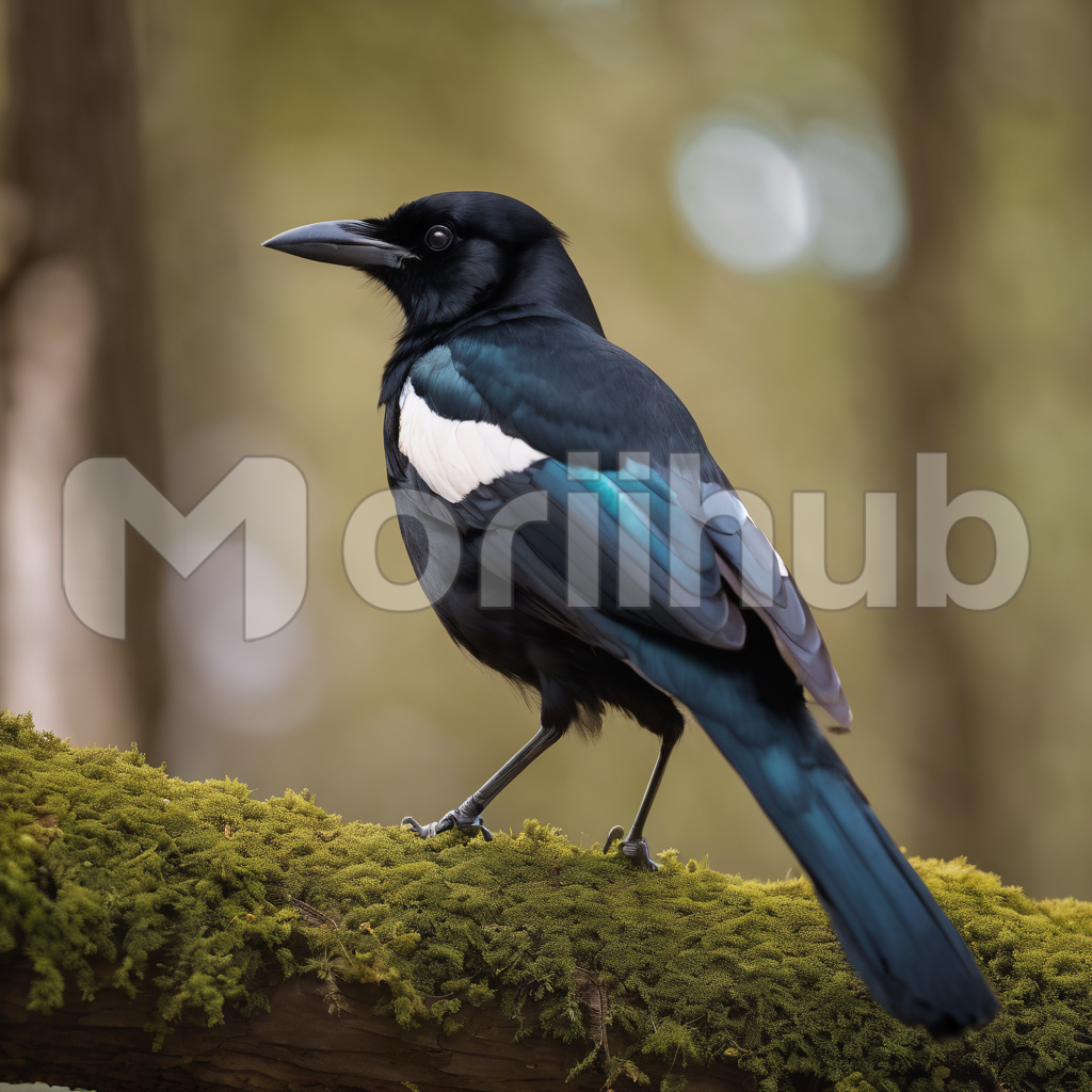 With glossy plumage catching the light, a magpie graces a branch in quiet contemplation. The intricate black and white patterns create a striking silhouette against the foliage. Its tail feathers cascade with elegant symmetry, a testament to avian grace. The magpie’s back view, perched atop the branch, captures a moment of serene observation, blending nature’s beauty and the bird’s inherent majesty in a harmonious display of avian charm.