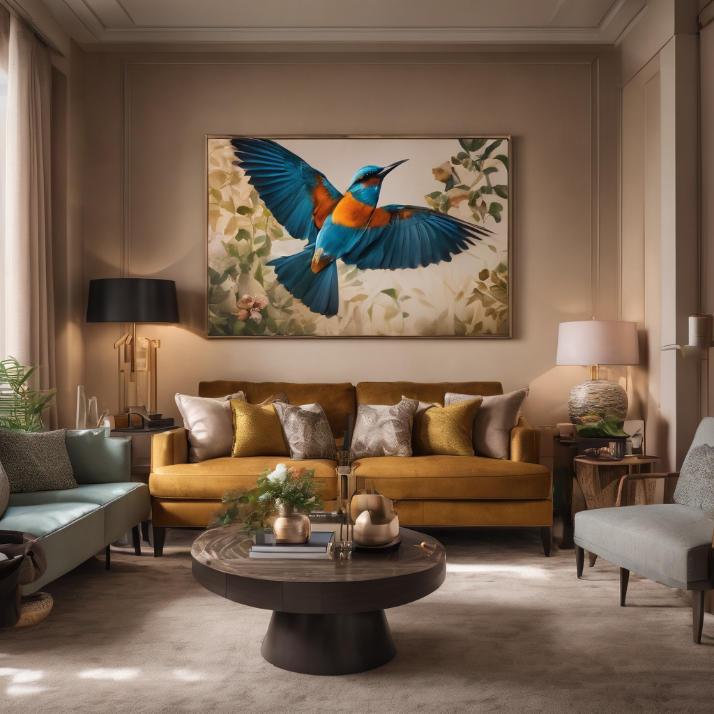 A cozy living room beckons with the warmth of comfort. A plush couch, adorned with cushions, cradles relaxation around a round coffee table—a hub for shared moments. Adorning the wall, a captivating piece of bird art takes flight, injecting the space with avian elegance. The room becomes a harmonious blend of comfort and aesthetic, where the artistry of decor converges with the allure of a welcoming haven for shared conversations and serene contemplation.