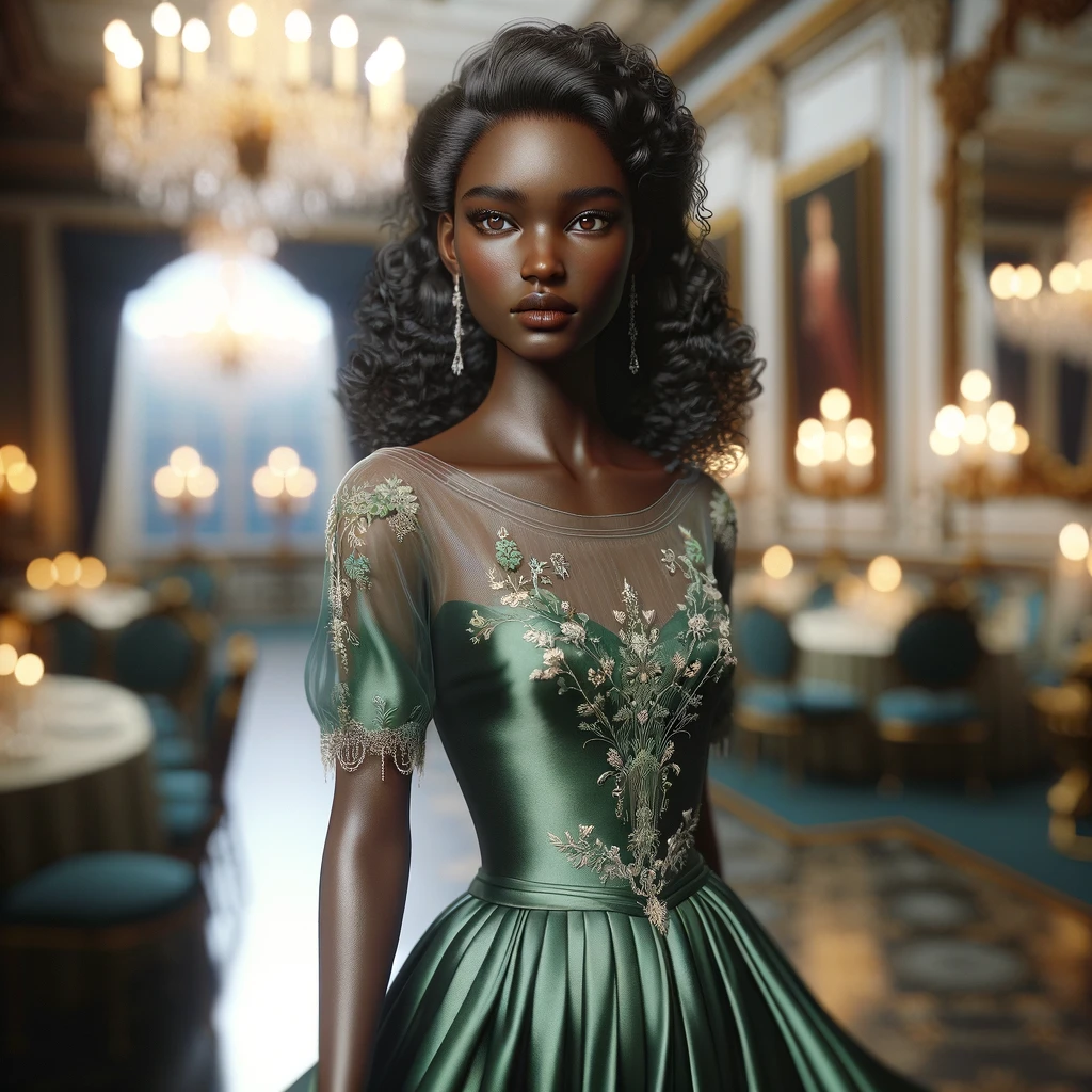 In a scene of timeless elegance, a young African woman radiates grace and beauty in a flowing evening gown. Crafted from luxurious silk, the gown drapes her form with effortless allure, its deep emerald hue accentuating her radiant skin. With each step, she exudes confidence and poise, a vision of sophistication and style.