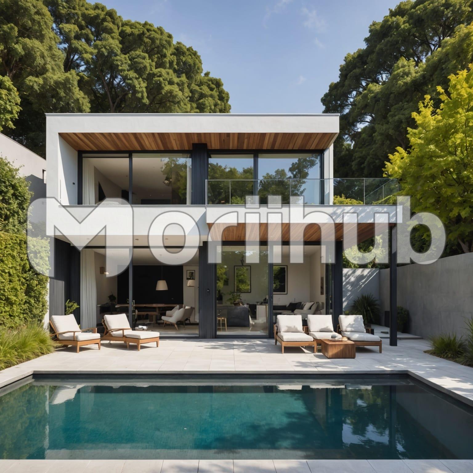 A picturesque house stands gracefully beside a shimmering pool, creating a perfect oasis for relaxation. Inviting reclining chairs are positioned poolside, their cushions invitingly soft and ready for lounging under the sun. Surrounding the area, lush trees provide a natural privacy barrier, their leafy canopies swaying gently in the breeze. The tranquil sound of water lapping against the pool’s edge adds to the serene atmosphere. This idyllic setting invites you to unwind and enjoy leisurely afternoons, surrounded by nature’s beauty and the comforts of home.