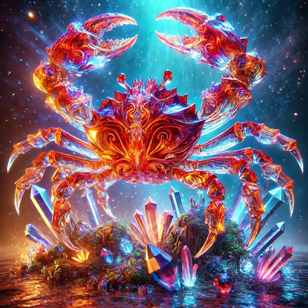 This image features a powerful crystal sculpture of a crab, intricately carved from translucent crystal that captures light in dazzling colors. The crab’s body and pincers are infused with rich, fiery tones—glowing reds, oranges, and electric blues—symbolizing raw energy and strength. The crab is surrounded by a dynamic aura, with crackling energy bursts radiating from its form, emphasizing the power element.