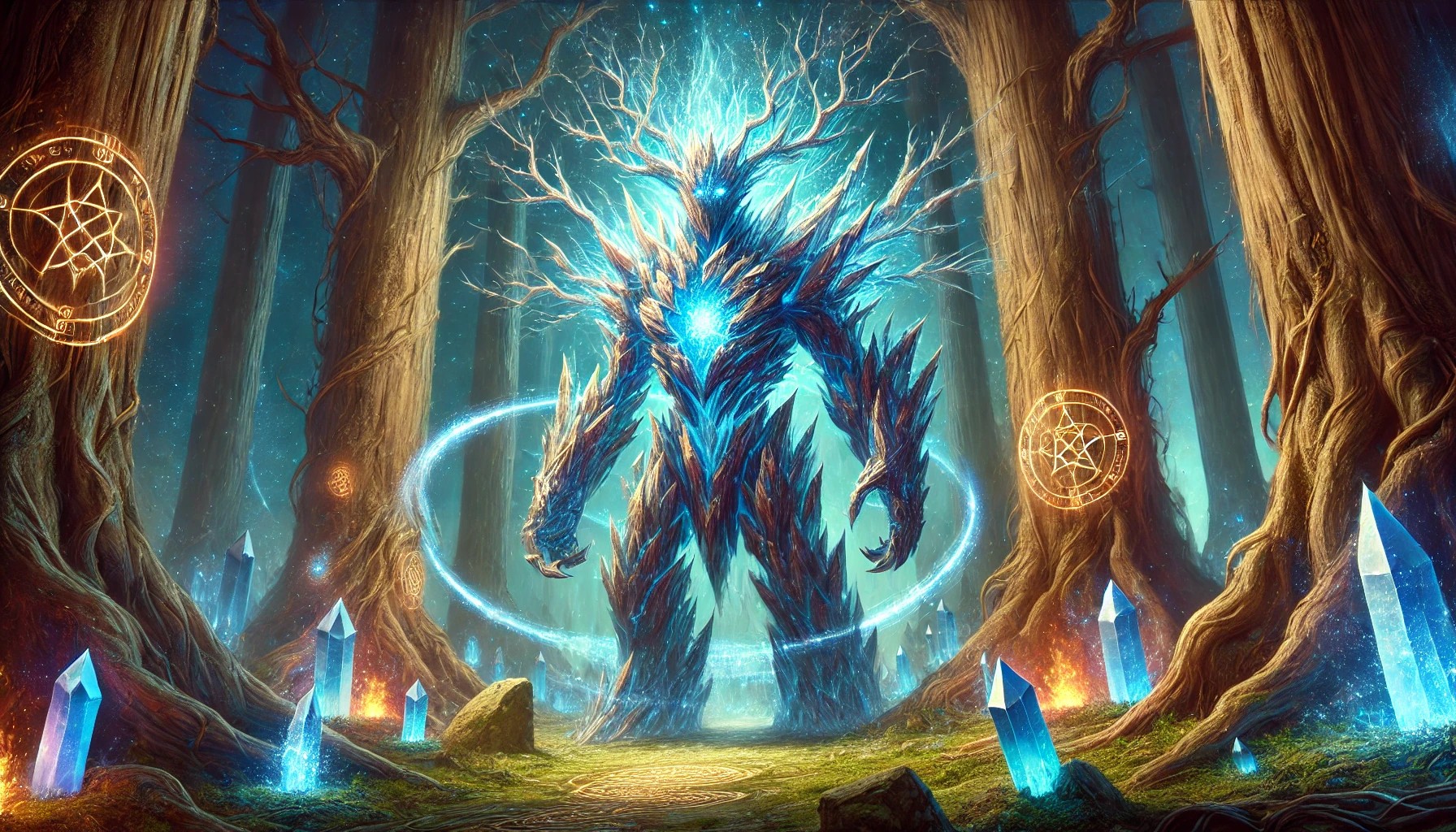 This towering guardian stands tall in an ancient mystical forest, its massive body composed of sharp, translucent crystal bark that pulses with an inner energy core.