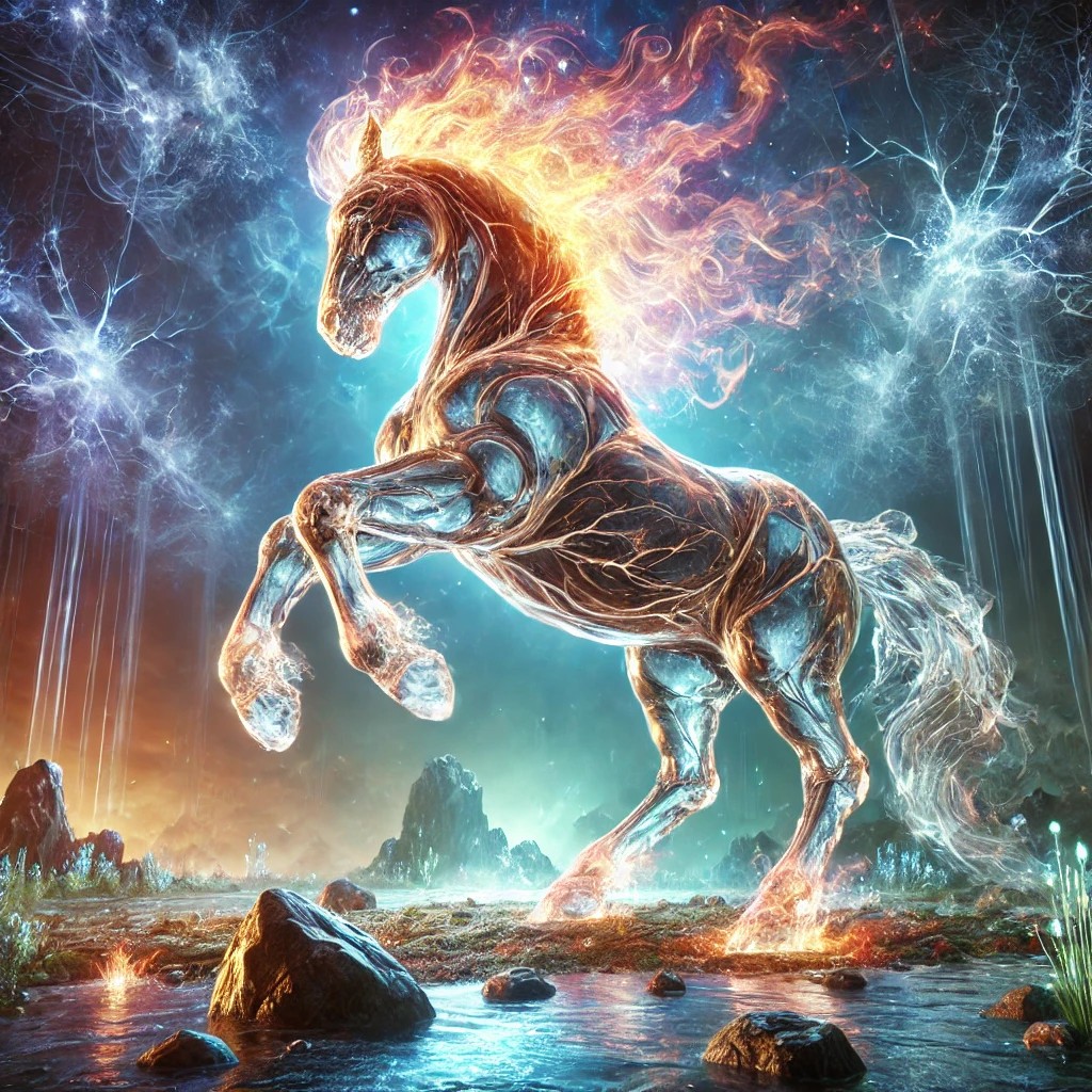 The image depicts a breathtaking crystal horse infused with elemental power, standing majestically in a mystical landscape. The horse’s body is sculpted from translucent, glowing crystal, with shimmering veins of energy coursing through its form. Its mane and tail are composed of swirling fire and crackling lightning, radiating intense power.