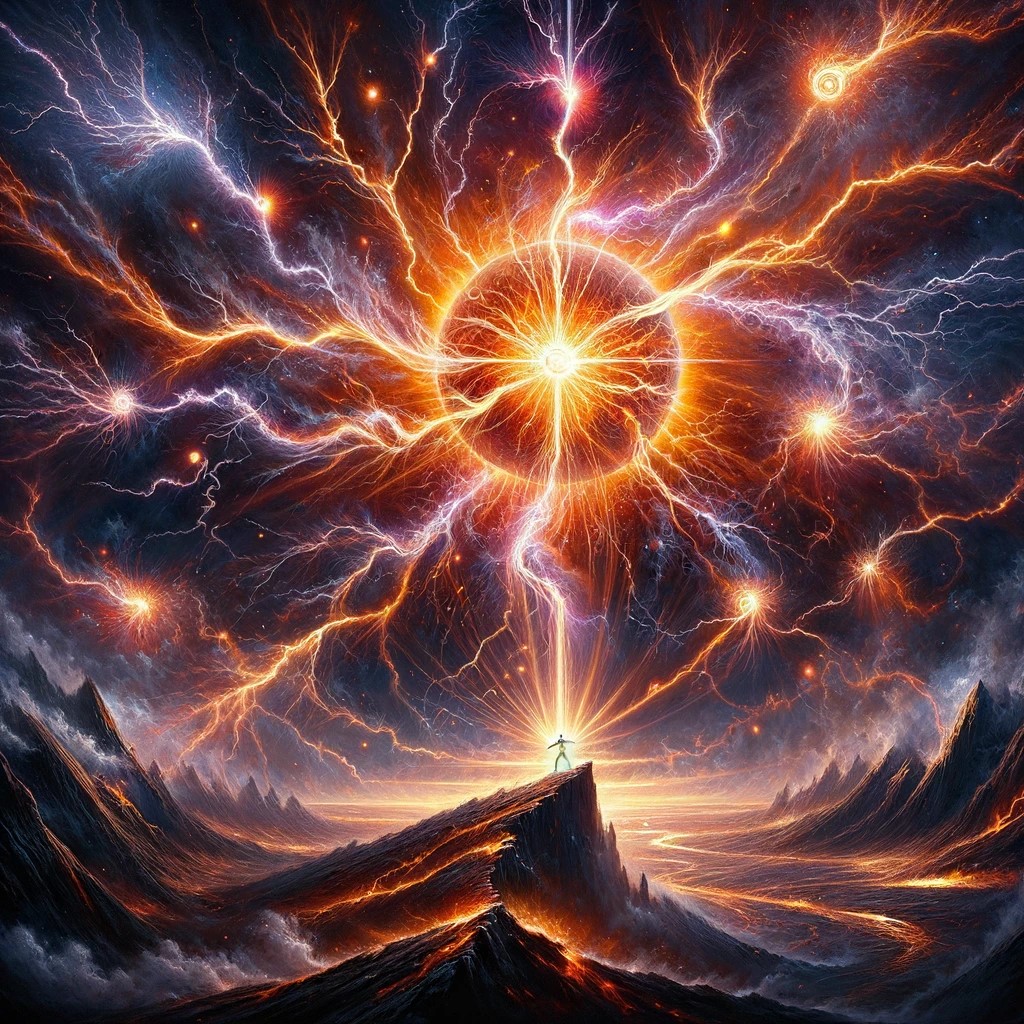 In a stormy sky crackling with lightning, the “Power Star” glows with an intense, fiery light—radiating bright reds, golds, and electric blues. Its surface is surrounded by arcs of energy, constantly surging and pulsing outward in massive bursts. The sky around the star is dark and turbulent, filled with swirling clouds charged with electricity. Below, the landscape trembles, with mountains splitting and rivers boiling from the raw force of the star’s energy.