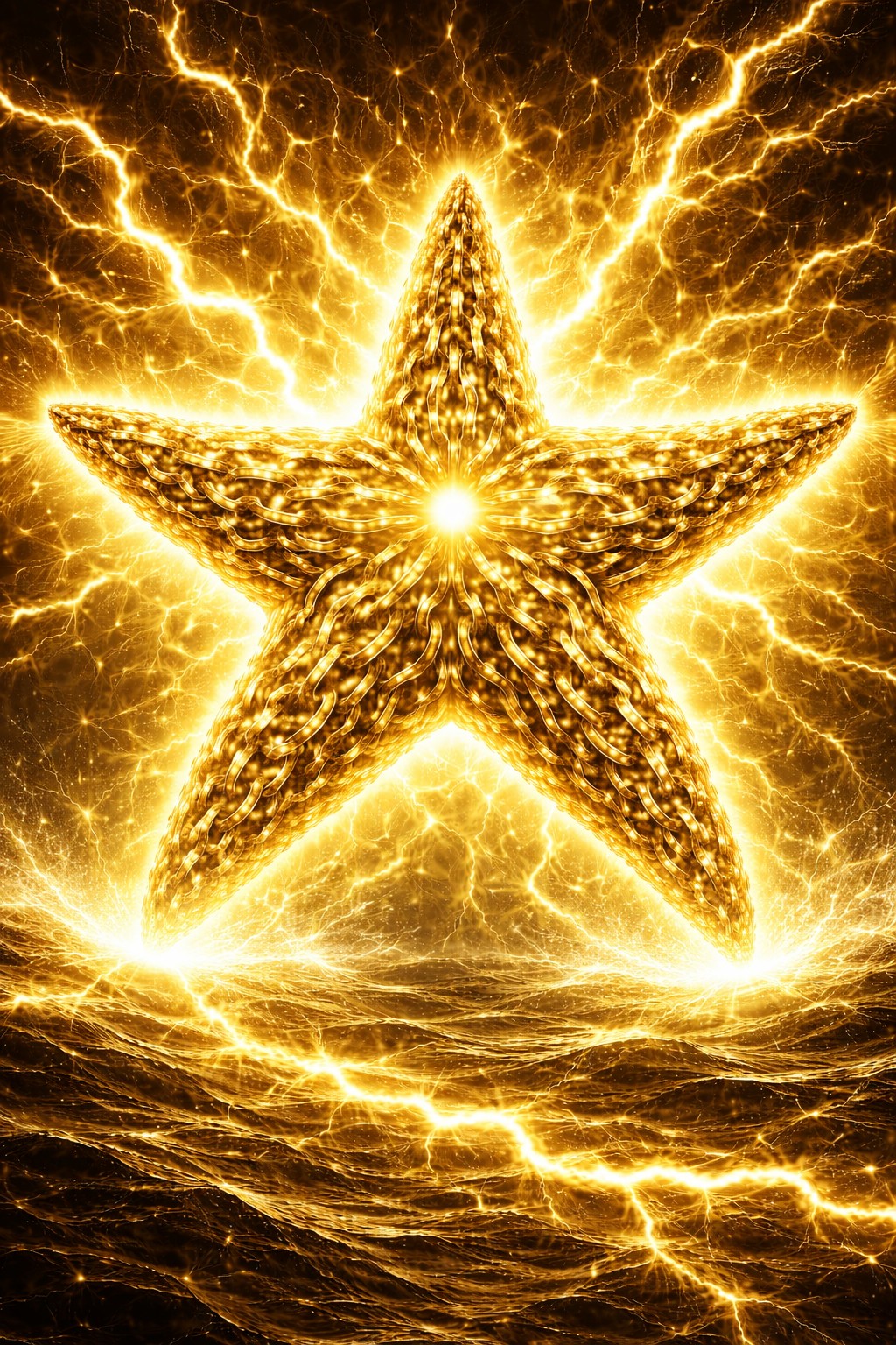 The image features a powerful starfish made entirely of glowing, interconnected golden chains. At its core, a blinding orb of light pulses with energy, radiating intense yellow lightning that crackles across the sea. Each of the starfish’s five arms is formed from the luminous chains, and they emit brilliant energy, arcing lightning bolts into the turbulent waters below.