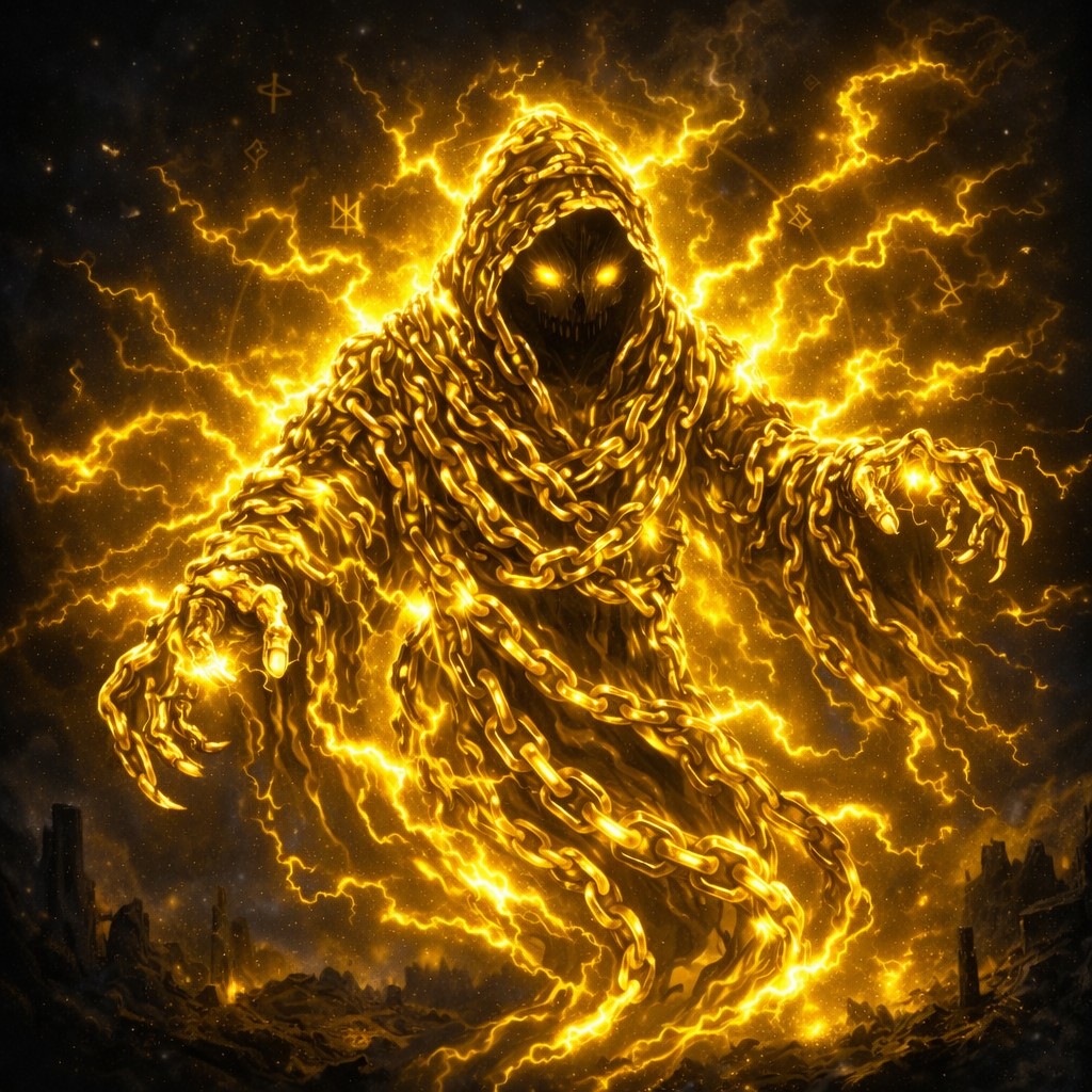 The chain-wraith towers like a living storm, its entire body woven from heavy golden links that glow as if forged from captured lightning. A tattered hood of chains hides its face in shadow, save for two burning yellow eyes and a jagged grin of darkness. Bolts of electric light race along its metal limbs, leaping from link to link before exploding outward into a halo of crackling energy that claws at the sky.