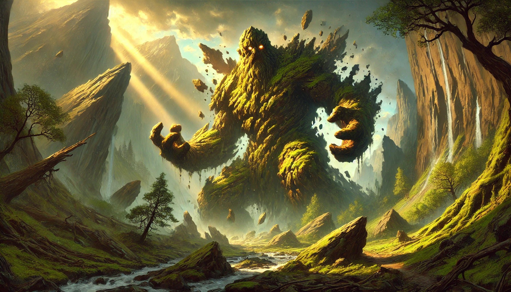 The image depicts a mighty Earth Elemental in a dramatic fantasy landscape. The Elemental, towering and made of stone, is covered in moss, with glowing eyes that hint at its ancient power. Its stone-like skin appears to pulse with inner energy, causing rocks and boulders to rise around it as it commands the earth beneath its feet.
