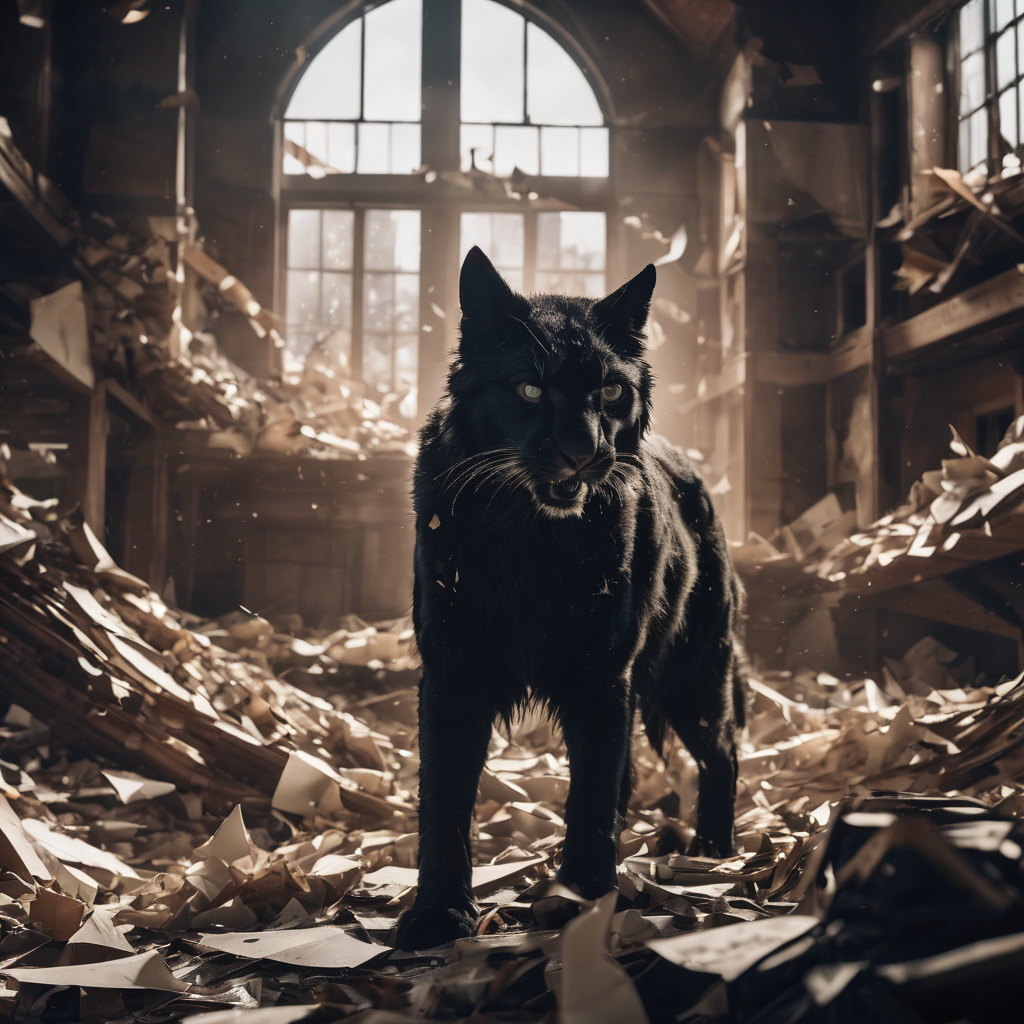 In the eerie confines of the abandoned room, a large black wild cat prowls with silent intensity, its predatory gaze piercing the darkness. Amongst the scattered debris, pieces of paper lie strewn across the floor, fluttering softly in the still air. With each stealthy step, the feline creature moves with primal grace, a shadowy presence amidst the desolation. In this forgotten space, the cat reigns supreme, a silent sentinel of the abandoned realm.