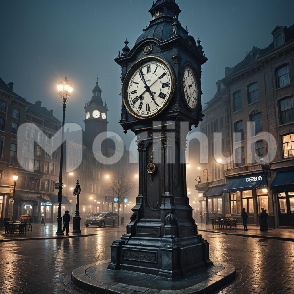On a busy city street, a grand clock stands tall, mounted on an intricately designed pole with vintage flair. Its face, large and circular, displays elegant Roman numerals, with hands that sweep steadily across the dial. The clock, a blend of metal and glass, gleams under the city lights, serving as a timeless landmark for hurried pedestrians. Surrounding the clock are bustling cafes, shops, and towering buildings, each contributing to the lively urban atmosphere. Cars whiz by, and people pause momentarily to check the time, the clock silently guiding the rhythm of city life. Beneath its presence, the city pulses with energy, yet the clock remains a steadfast symbol of order amidst the chaos.
