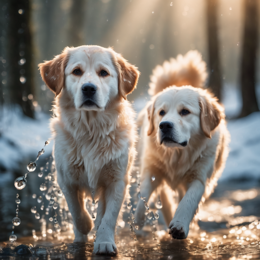 Through the rain-soaked streets, a pair of dogs plod with playful abandon, their drooping ears brushing against glistening fur. As they tread through a puddle, splashes of water erupt around them, creating a symphony of joyous chaos. Their tails wag in sync with each step, mirroring the exuberance reflected in their eyes. It’s a scene of simple delight, where the beauty of companionship and the innocence of canine curiosity converge in a fleeting moment of pure happiness.