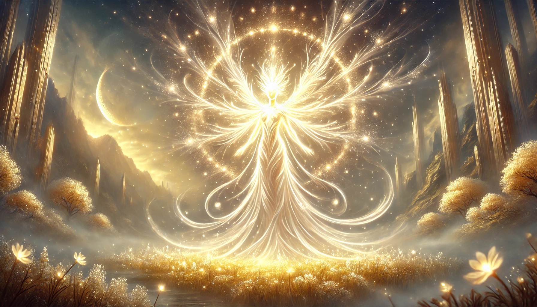 A fantasy illustration of a Light Elemental, radiant and ethereal, hovering above a serene, otherworldly landscape.