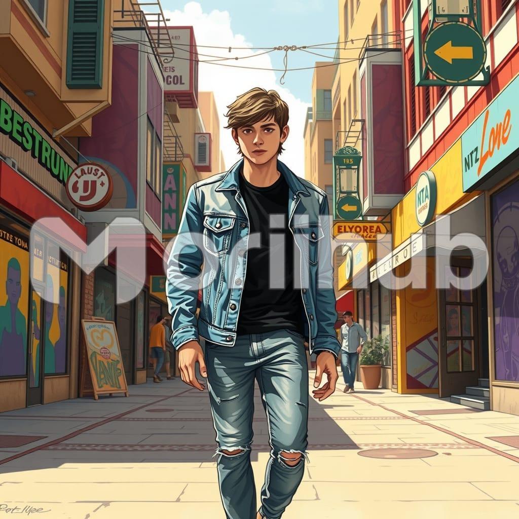 An animated man strides confidently down the street, his movements full of energy. He’s wearing a jean jacket over his outfit, which adds a casual yet stylish touch. The jacket contrasts with the vibrancy of his stride. He seems engaged in the moment, his eyes scanning the surroundings with interest. A few people can be seen walking behind him, their presence adding a subtle backdrop to his lively, purposeful movement. The scene captures the dynamic blend of individual and urban life.