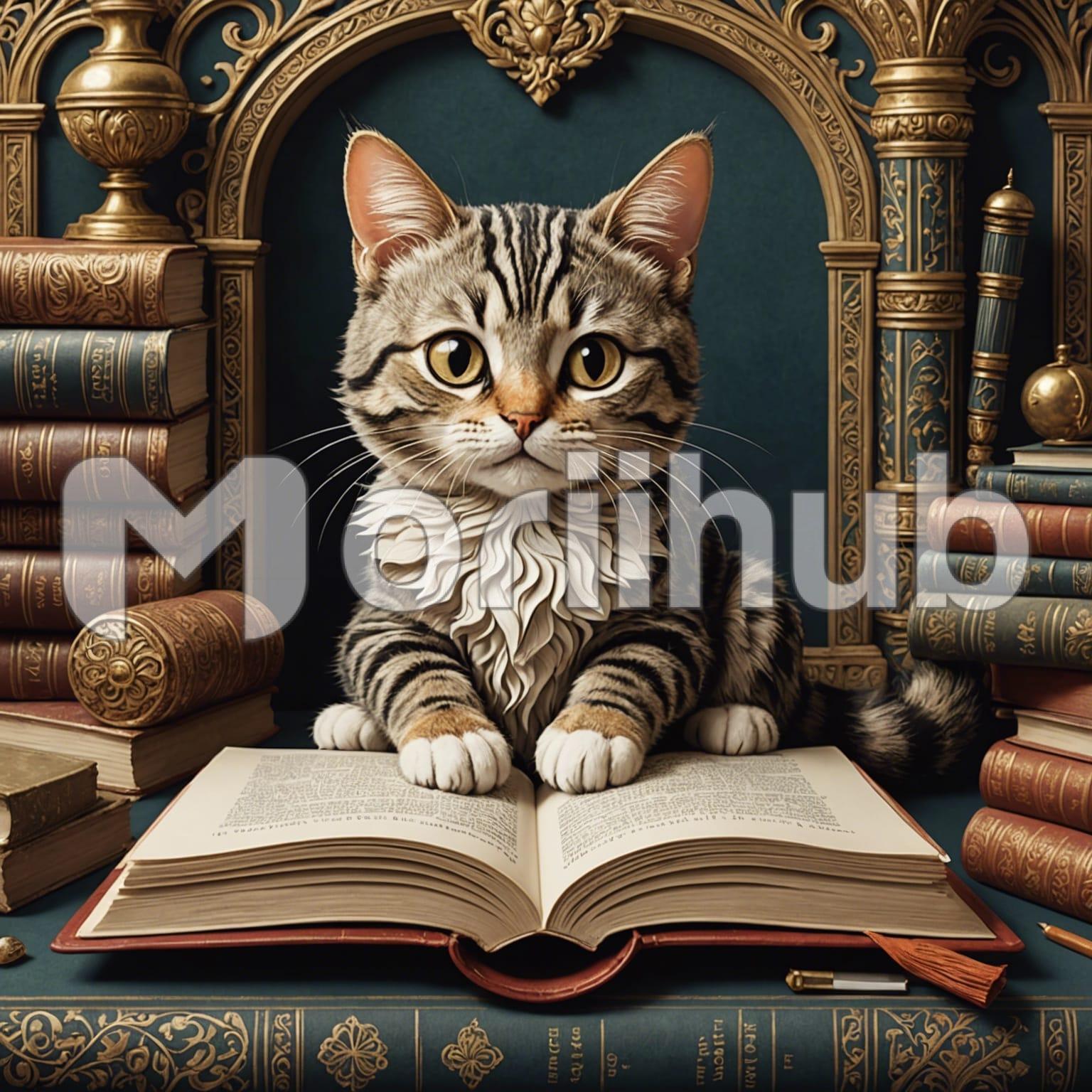 Perched in serene repose, the cat sits with poise, its gaze fixed upon the open book before it. With delicate precision, its paws rest gently on the pages, as if entranced by the printed words. In the corner, a stack of books stands tall, a testament to the feline’s literary curiosity. Amidst the quietude of the room, a harmonious scene unfolds, where the love of literature and the grace of a cat converge, creating a moment of pure tranquility and intellectual intrigue.