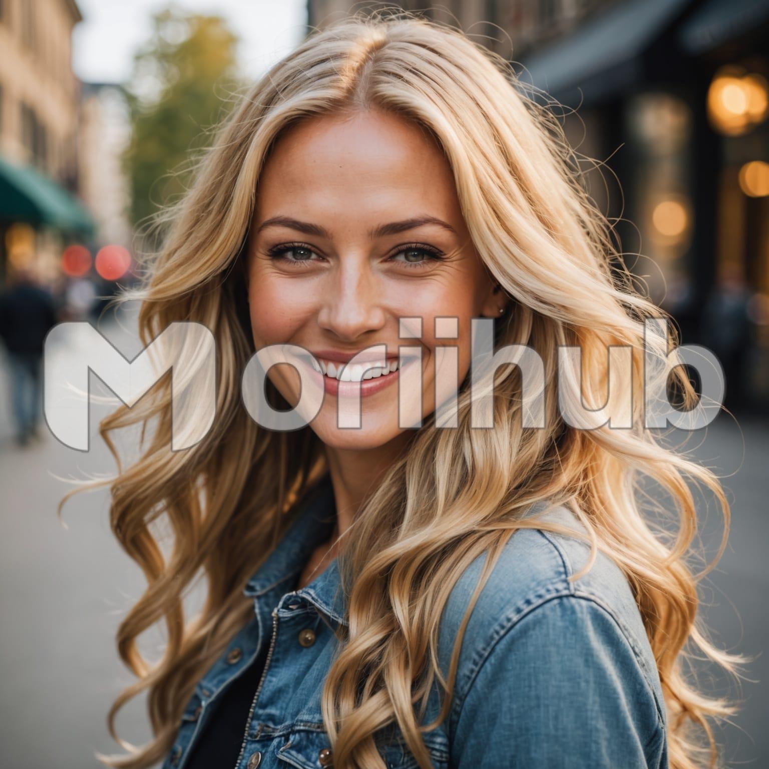 A stunning blonde woman radiates warmth and beauty. Her hair, cascading in soft waves, frames her face perfectly. Her smile is bright and genuine, lighting up her features with an undeniable charm. The expression she carries is one of effortless grace and confidence, making her presence feel inviting and approachable. Her eyes sparkle with a lively energy, complementing her radiant smile. Every detail of her appearance, from the shine in her hair to the glow in her expression, contributes to her captivating and memorable allure.
