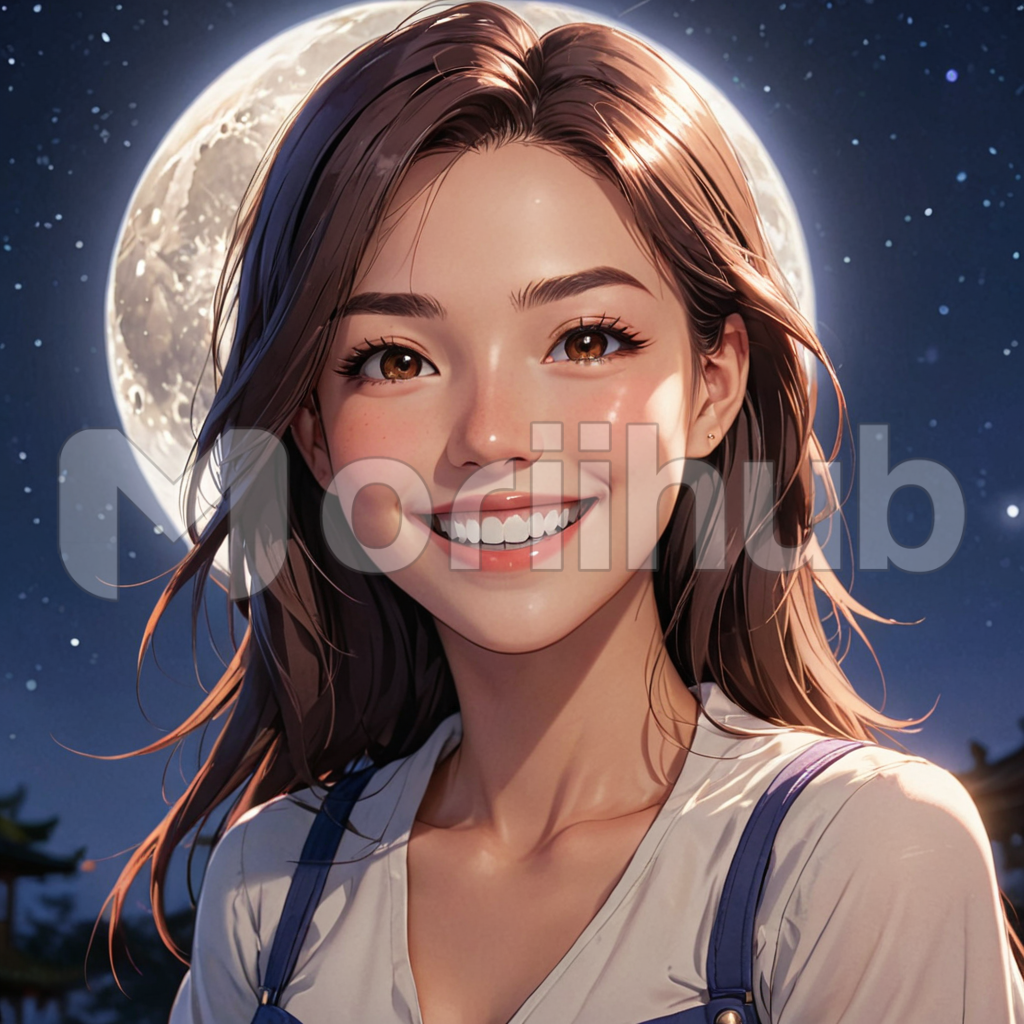 In a whimsical cartoon world, a woman beams with joy, her smile lighting up the scene. Behind her, the tranquil moon hangs in the sky, casting a soft glow upon the whimsical landscape. With each curve of her lips, her happiness radiates, echoing the gentle luminescence of the moon. Together, her infectious smile and the serene moon create a magical ambiance, evoking a sense of enchantment and tranquility in the viewer’s imagination.