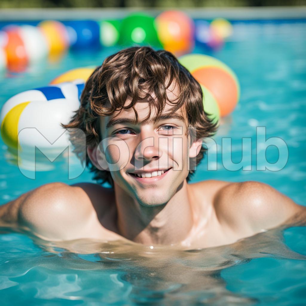 A radiant teenage figure graces the pool, the sun reflecting in their infectious smile. Amidst the shimmering water, they exude youthful joy, playfully engaging with a vibrant beach ball at their side. The atmosphere is one of carefree laughter and summer bliss, captured in a moment where the sunlit pool becomes a backdrop to the exuberance of adolescence, epitomizing the carefree spirit of a delightful summer day.