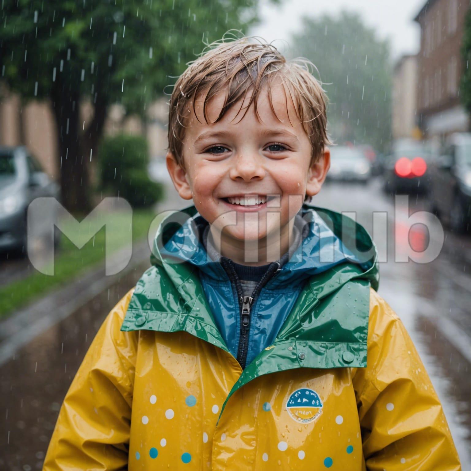 A cute little boy beams with joy, his smile bright and infectious as he stands under the rain. His raincoat, shelters him from the downpour, though his hair is wet and clings to his forehead. Drops of rain sparkle on his cheeks, enhancing his gleeful expression. The raincoat’s hood flops back, revealing his delight in the weather. He looks ahead, feeling the rain on his face, embodying pure, carefree happiness. The scene captures the essence of childhood, where even a rainy day becomes a moment of wonder.