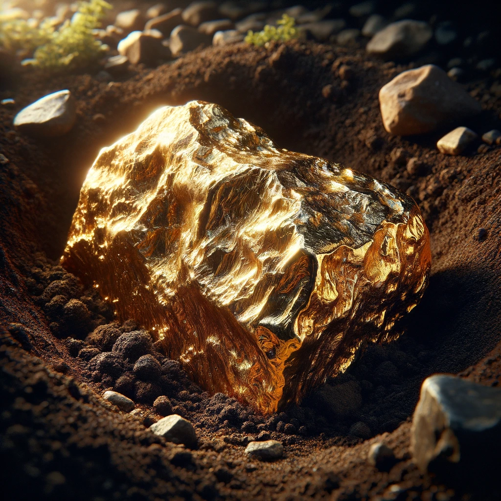 Behold a close-up glimpse of nature’s treasure: a sizable chunk of raw gold nestled within the earth. Its surface glistens with a radiant metallic sheen, catching the light in a dazzling display of brilliance. Despite its rough exterior, the gold exudes an undeniable allure, a testament to its inherent value and timeless allure.