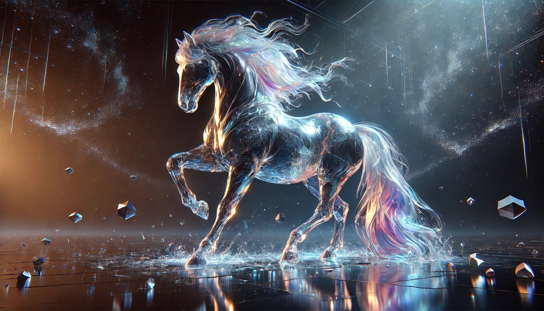 The Crystal Reality Horse stands as a breathtaking fusion of art and magic, its entire form sculpted from shimmering, translucent crystal. Its body refracts light in mesmerizing patterns, revealing shifting colors and glimpses of alternate dimensions swirling within. The surface appears both solid and fluid, as if reality itself struggles to define its true form.