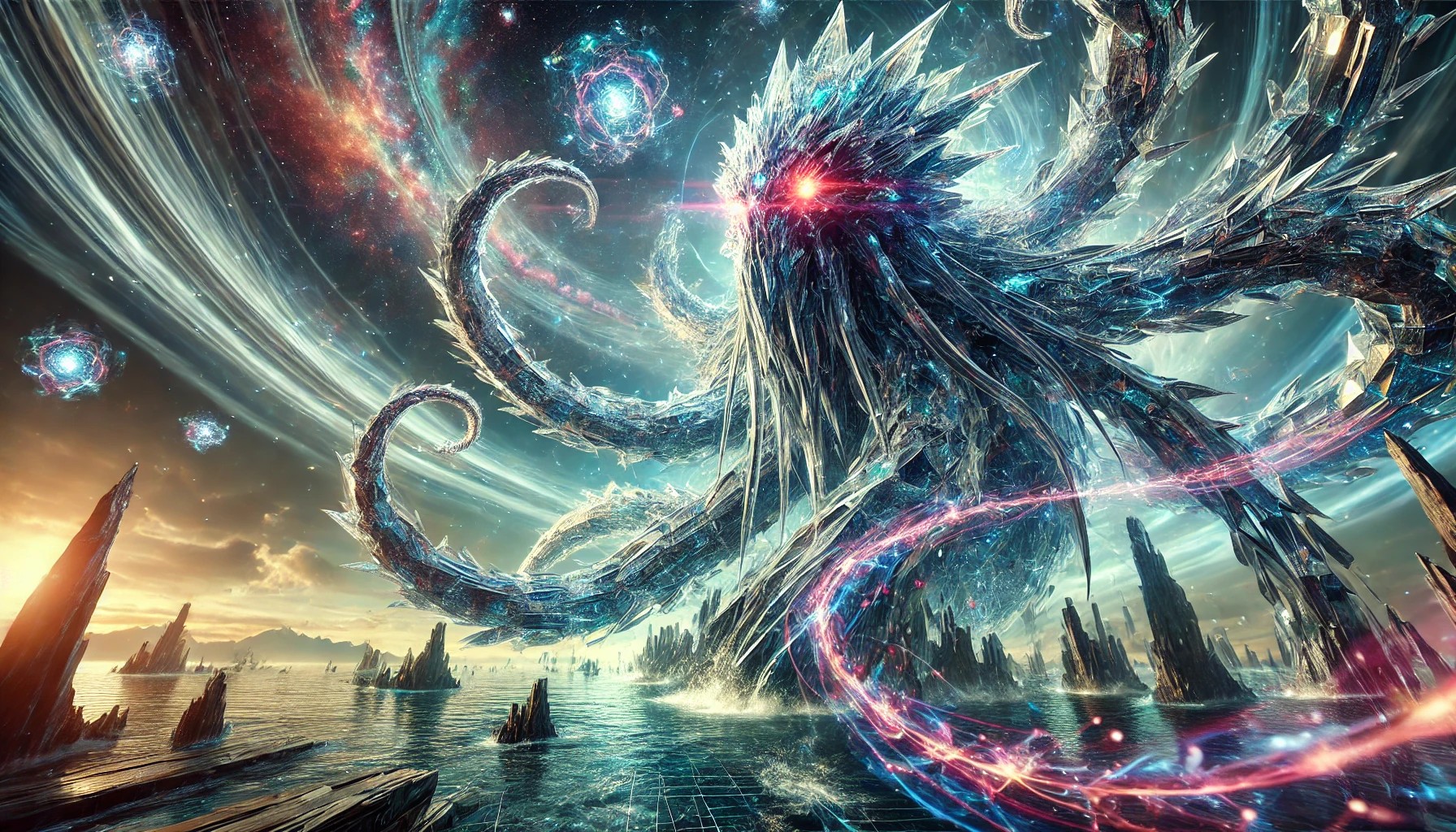 This awe-inspiring artwork features a colossal Crystal Kraken, an eldritch entity infused with the power of reality itself. Rising from a shimmering cosmic ocean, its massive crystalline tentacles twist and coil, bending and warping space around them. Each razor-sharp translucent shard pulses with shifting iridescent colors, as if the creature exists outside the boundaries of time and matter.
