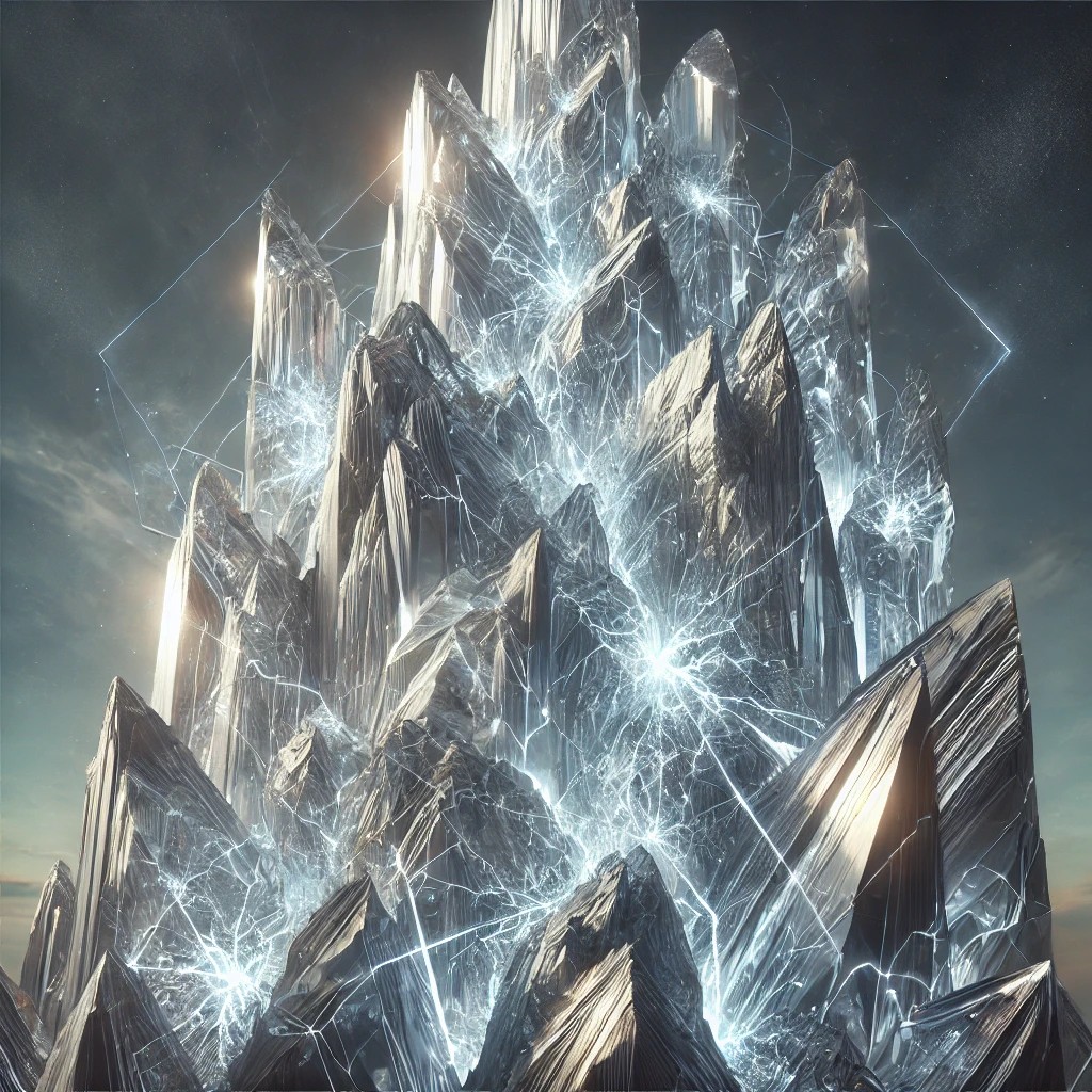 The image features a towering crystal mountain, its jagged peaks made of transparent quartz that shifts in hues of silver, white, and faint blue. The mountain radiates a subtle energy, with veins of glowing light running through the stone, symbolizing the grounding force of reality. The surface of the mountain appears to shift and alter slightly, as if it is in tune with the fabric of existence itself.