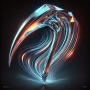 A crystal scythe shaped with sleek, jagged edges, radiating an ethereal glow. The scythe embodies the reality element, with reflective surfaces that distort the space around it, bending reality. The crystal glows with shifting colors, creating an aura that bends and ripples, reflecting the concept of altering reality. The design should look otherworldly, mystical, and powerful, capturing the essence of a magical artifact that can manipulate the fabric of reality.