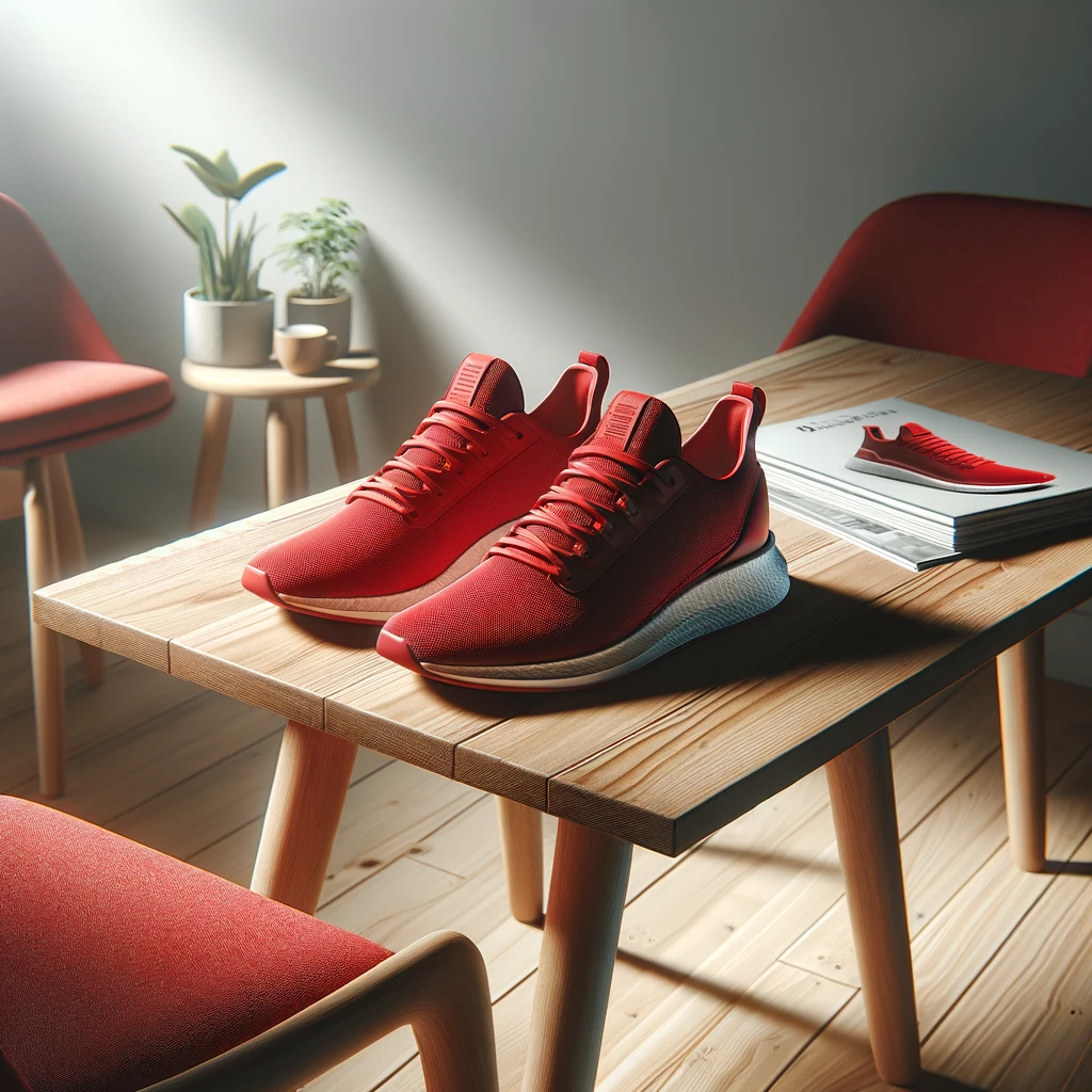 In this well-lit room, a pair of vibrant red sneakers rests atop a sleek, modern wooden table. Soft shadows dance around the edges, adding depth to the scene. The bold color of the sneakers contrasts beautifully with the minimalist aesthetic of the table, creating a striking visual focal point.