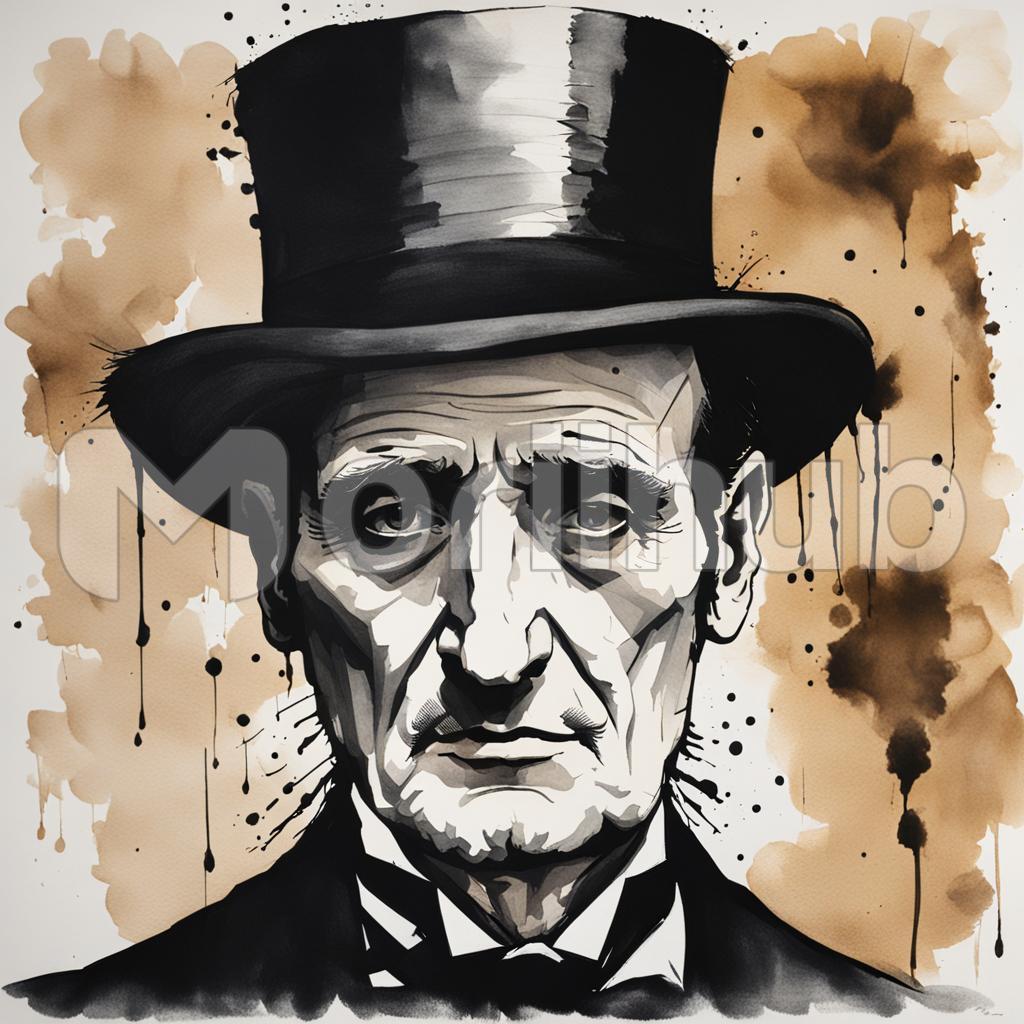 In the striking strokes of an ink painting, a distinguished man emerges, adorned in a top hat that exudes an air of sophistication and charm. His features are rendered with bold lines and subtle shading, capturing the essence of his refined demeanor. The top hat adds an element of elegance to his ensemble, elevating his stature and commanding attention. It’s a portrait that speaks of class and style, immortalized in the timeless medium of ink.