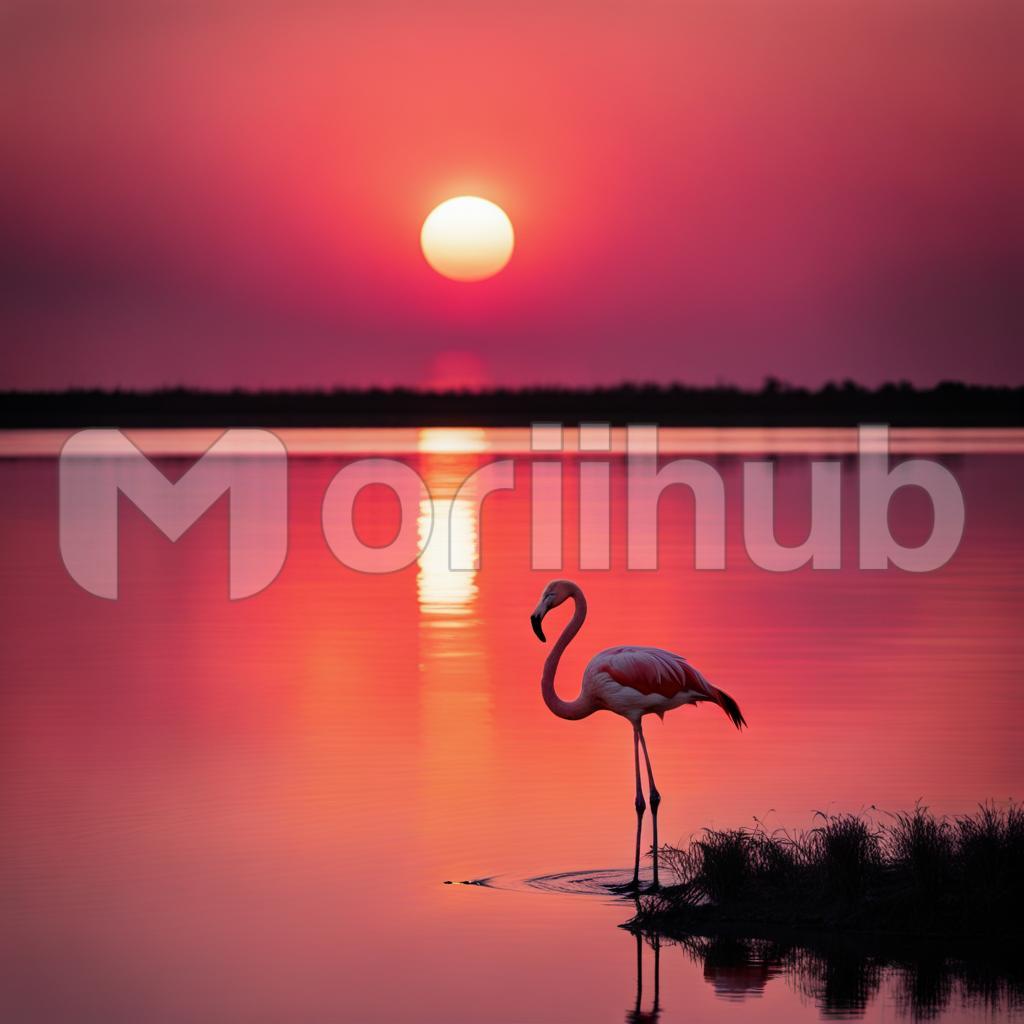 Atop the tranquil lake, a solitary flamingo stands as a living silhouette against the canvas of a vibrant sunset. The bird’s elegant form is mirrored in the rippling water, creating a mesmerizing reflection. As the sun dips below the horizon, hues of orange and pink dance on the lake’s surface, encapsulating a moment of serene beauty. The flamingo, bathed in the warm glow, becomes a living beacon in this twilight spectacle, a majestic guardian of the tranquil waters.