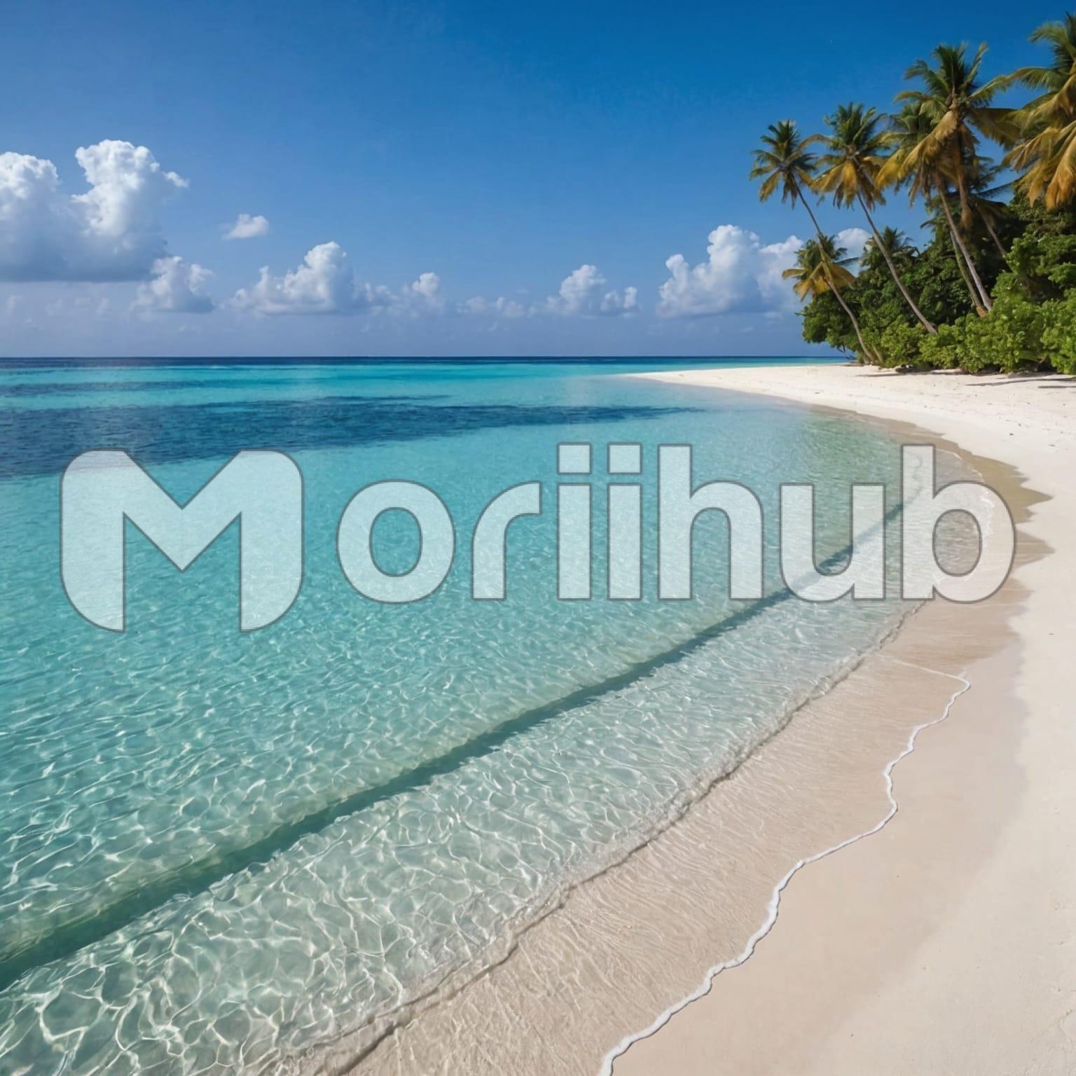 The beach stretches out with pristine, crystal-clear waters gently lapping against the shore. The white sand is soft and powdery, forming a serene contrast with the vibrant blue of the sea. In the background, tall palm trees sway lightly in the breeze, their lush fronds adding a touch of tropical elegance to the scene. Sparse clouds drift lazily across the sky, casting occasional shadows and enhancing the tranquil atmosphere. The overall view is one of perfect coastal beauty, evoking a sense of relaxation and natural splendor.