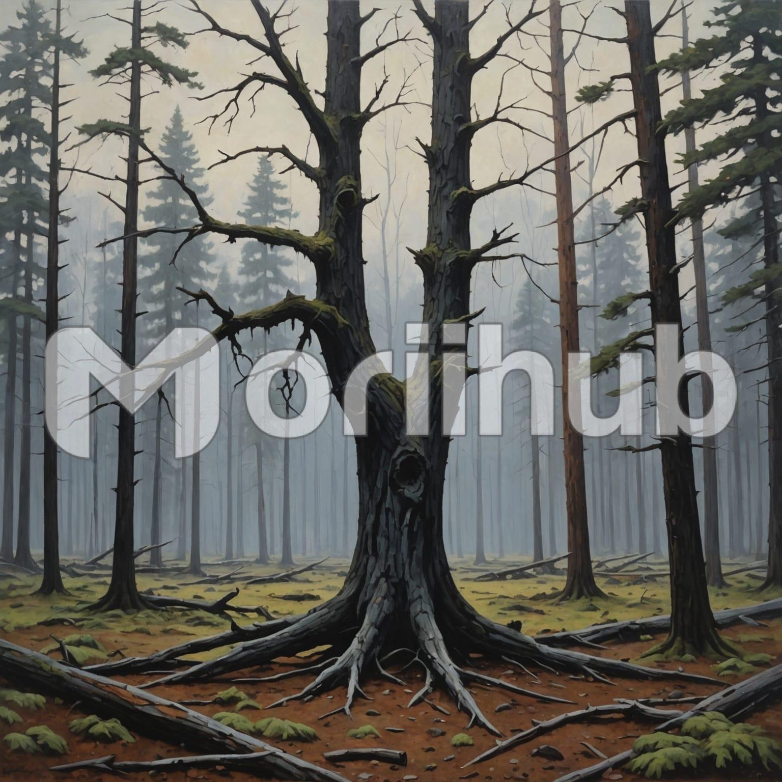 In the woods, a diverse tapestry of trees creates a rich, textured scene. Some trees stand withered, their once vibrant branches now bare and twisted, adding a touch of stark, silent beauty. In contrast, others in the background are lush, their leaves providing a verdant canopy that contrasts with the more desolate figures. The play of life and decay among the trees paints a picture of natural resilience and change, where the withered and leafy trees coexist, each telling its own story within the forest.