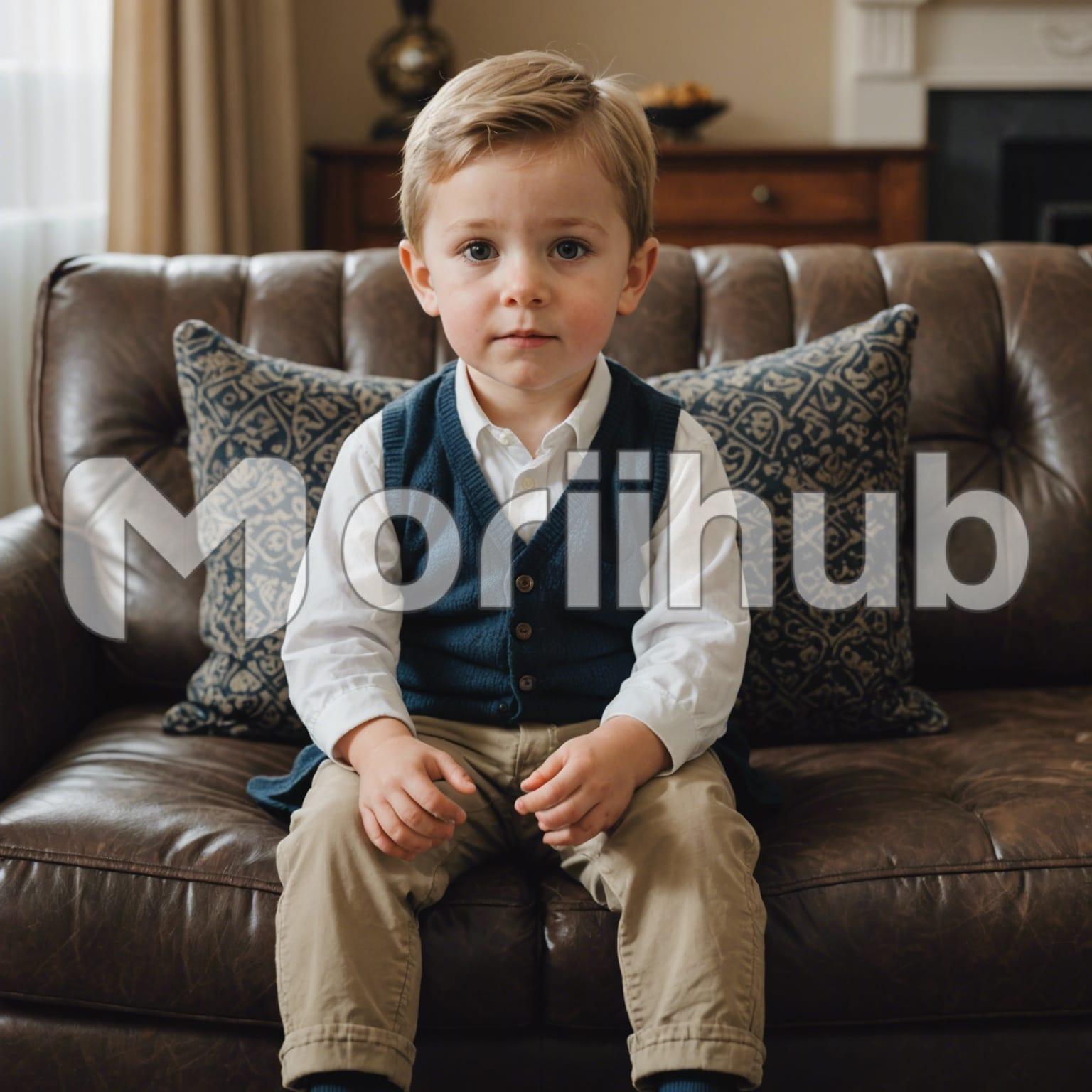 A young boy sits comfortably on an indoor couch. His gaze is thoughtful, perhaps lost in a moment of quiet reflection. His tousled hair and relaxed posture suggest a moment of ease and contentment. The soft lighting in the room highlights the subtle contours of his face and the texture of the couch fabric. The scene conveys a simple, serene moment of childhood, where time seems to pause briefly in the warmth and comfort of home.