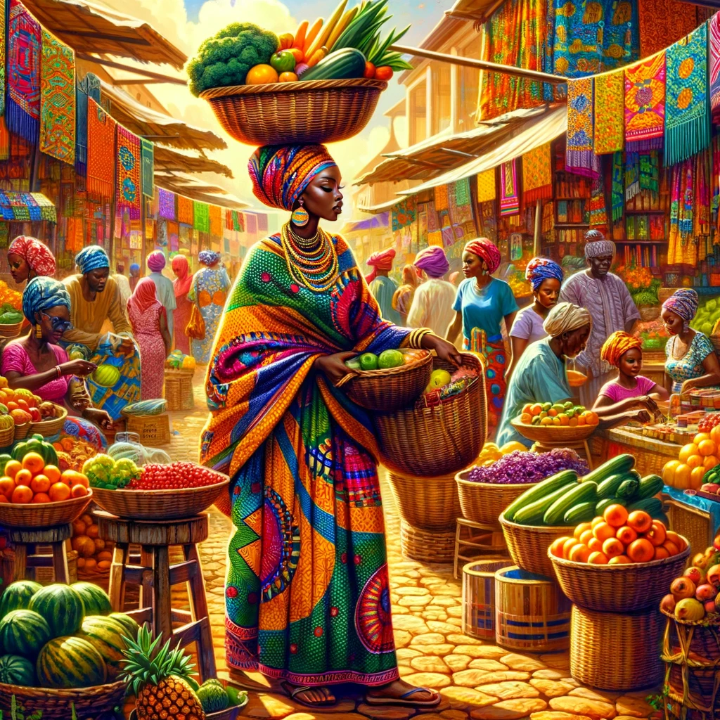 In the lively ambiance of an African market, a vibrant scene unfolds as an African mom navigates through the bustling stalls. Adorned in traditional attire, her garments burst with vibrant colors and intricate patterns, reflecting the richness of her culture. With a discerning eye and confident stride, she selects fresh produce and spices, immersing herself in the sights, sounds, and flavors of her heritage. Around her, the market buzzes with activity, creating a kaleidoscope of culture and community. In this vibrant tapestry of African life, she stands as a proud embodiment of tradition and resilience.