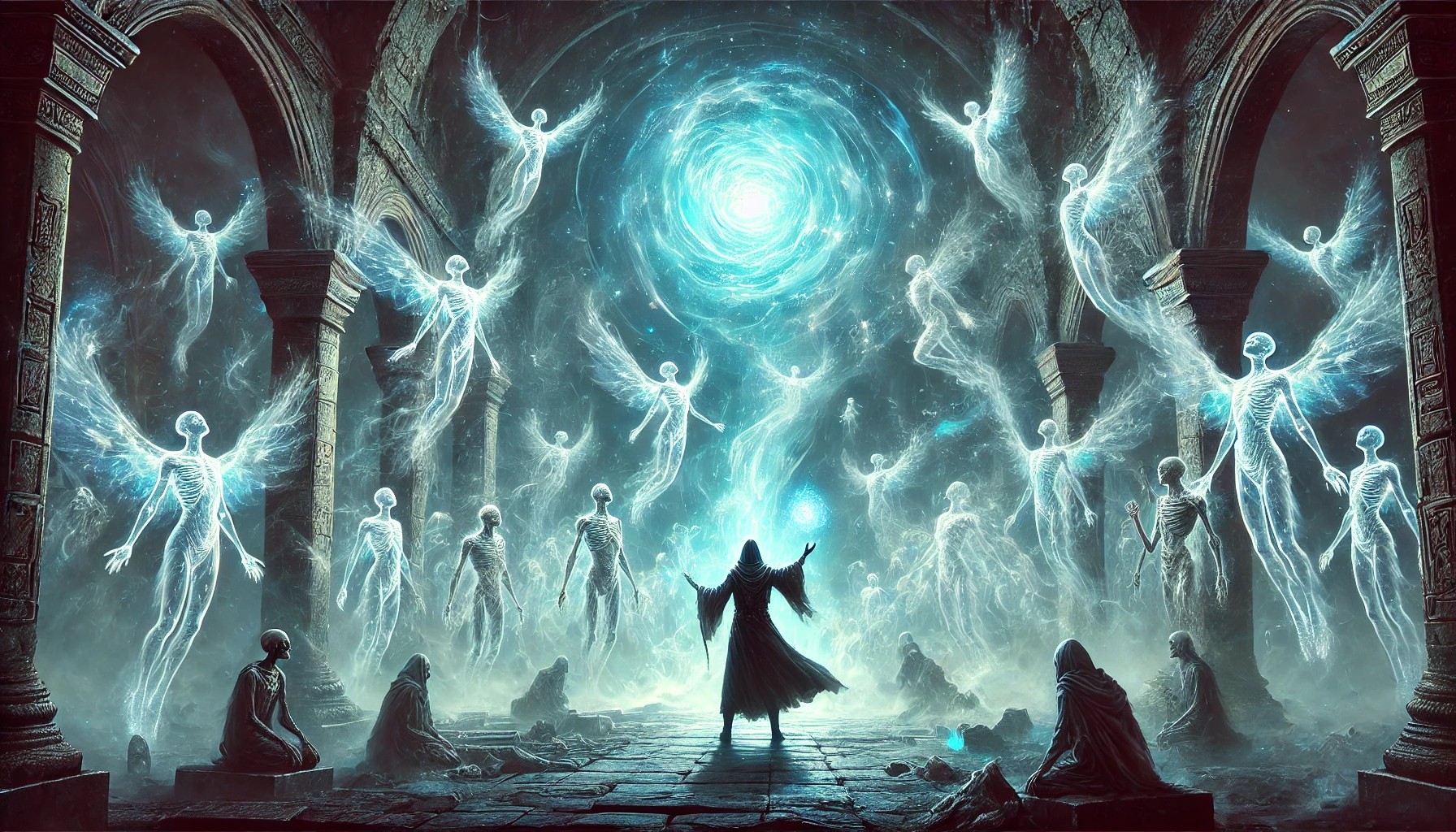 This illustration captures a haunting yet beautiful moment infused with the essence of souls and the afterlife. A lone warrior stands in the heart of an ancient ruined temple, their hands outstretched as they channel a glowing blue-white energy. This mystical force connects them to countless ethereal souls rising from the cracked stone floor, their translucent forms swirling like mist. Some souls appear peaceful, drifting toward the sky, while others twist in sorrow, trapped between realms.