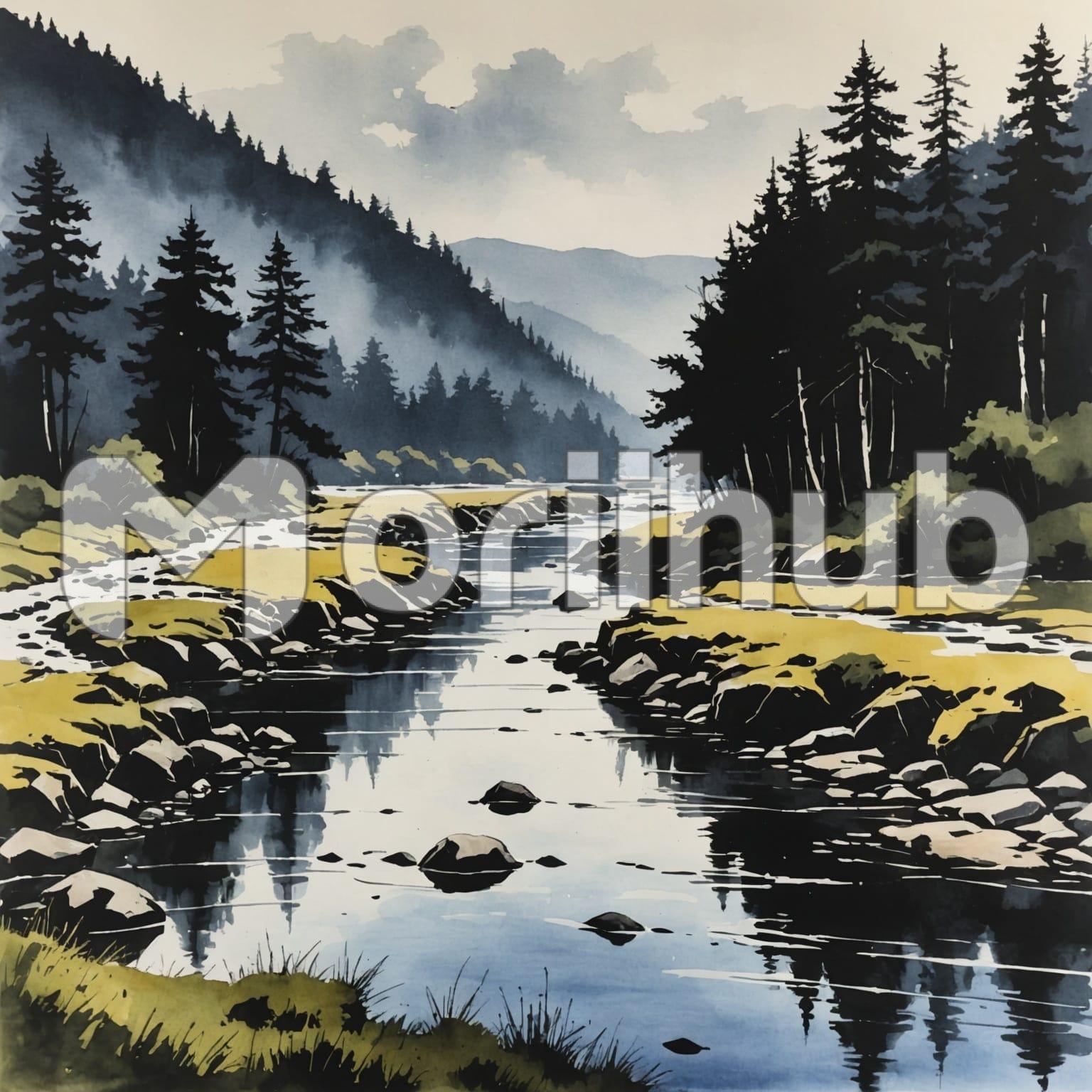 The ink painting depicts a serene river winding through the canvas, its gentle flow captured with delicate brushstrokes. On either bank, tall pines stand in elegant silhouettes, their branches creating a rhythmic pattern against the backdrop. The river’s surface is rendered with subtle, fluid lines that mirror the calm of the scene. The pines, with their slender trunks and wispy needles, frame the river with a timeless grace. The overall effect is a tranquil, harmonious composition, evoking the peaceful simplicity of nature.