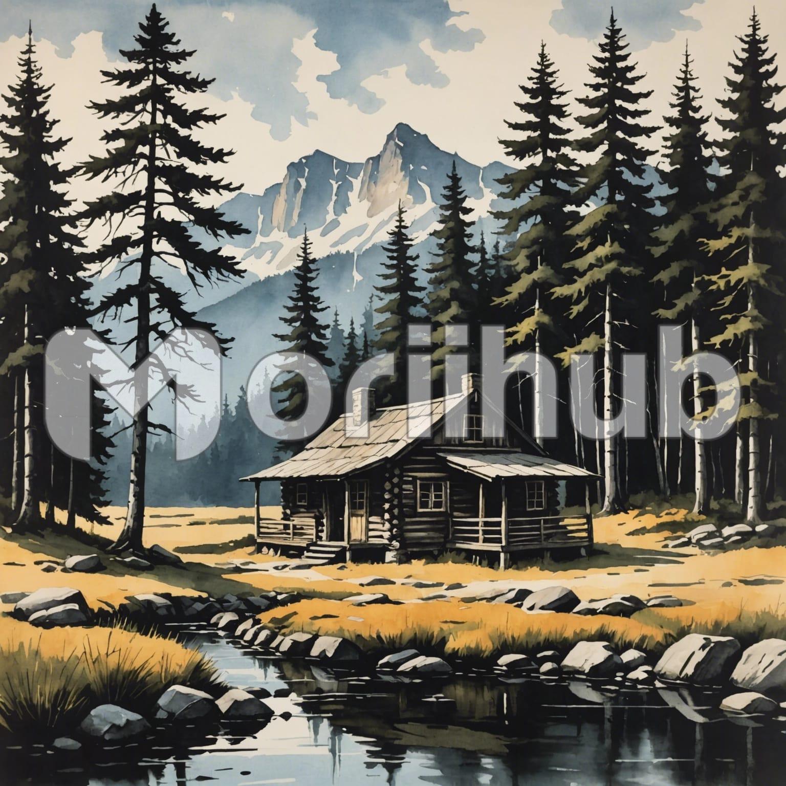 Nestled by the tranquil river, a quaint cabin stands amidst a lush forest, its wooden facade blending harmoniously with the natural surroundings. Towering trees envelop the scene, their canopies casting dappled shadows upon the riverbank. In the distance, a majestic mountain looms, its rugged peaks piercing the sky with stoic grandeur. Against the serene backdrop of flowing waters and majestic landscape, the cabin offers solace and sanctuary in nature’s embrace.